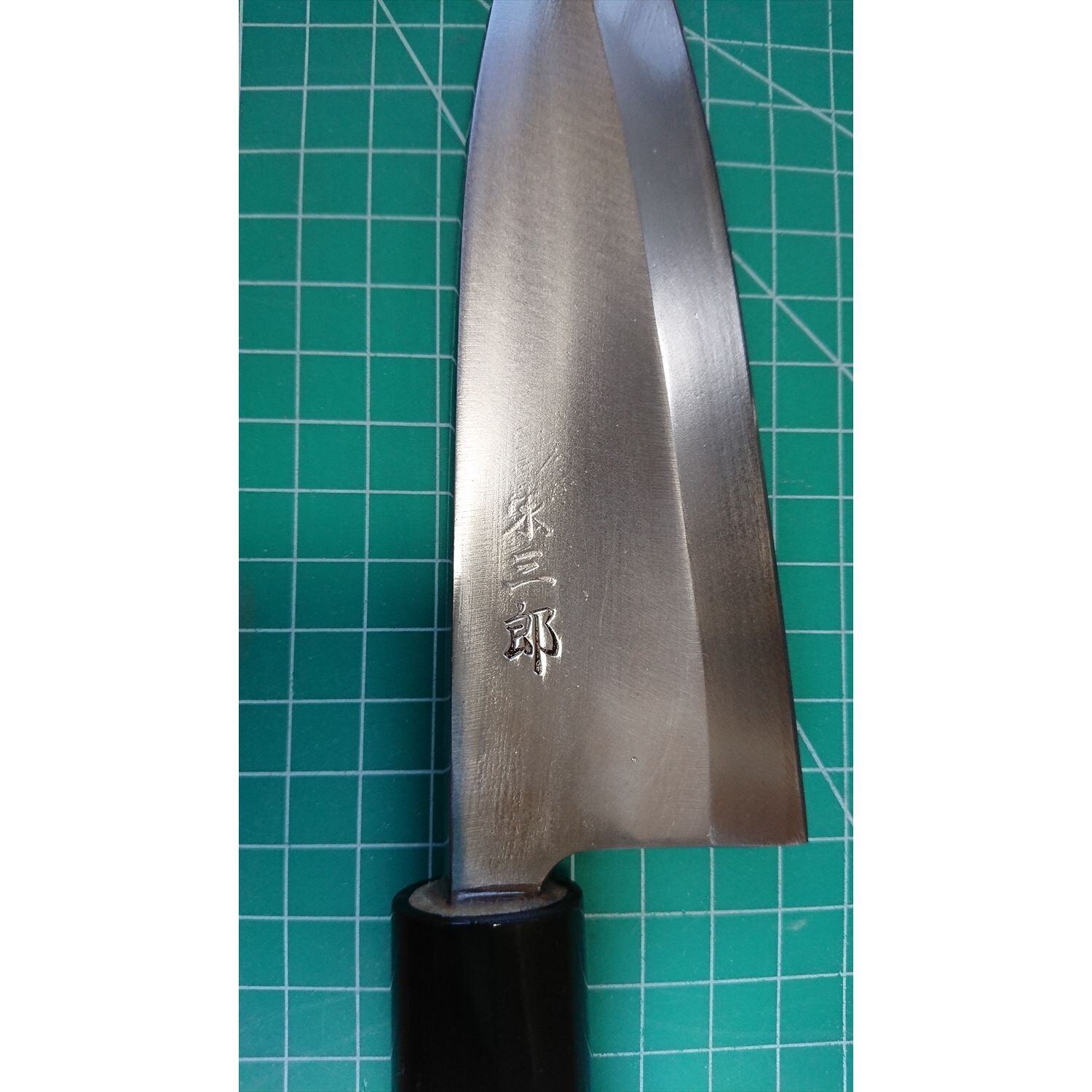 1. o2606/状態:中古/銘:栄三郎?/出刃包丁(片刃 右利き用)/刃長:160/峰厚 アゴ上:7.8/重量:234/作り:鋼/他:柄は当社にて新品と交換済み