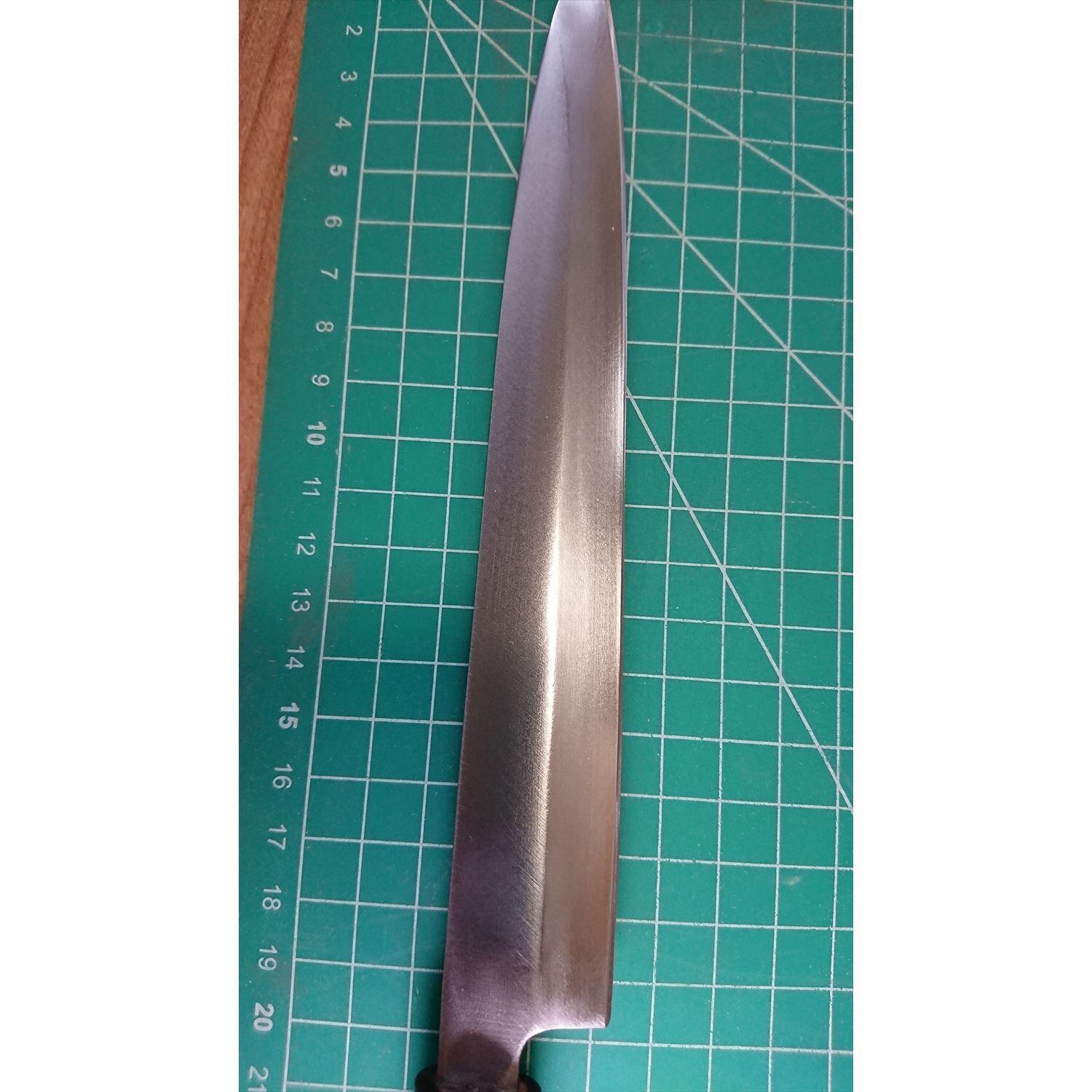 1. o2628/状態:中古/銘:?千代/刺身包丁(片刃 右利き用)/刃長:195/峰厚 アゴ上:2.8/重量:97/作り:鋼/他:柄は当社にて新品と交換済み 銘はクリーニングにより消失