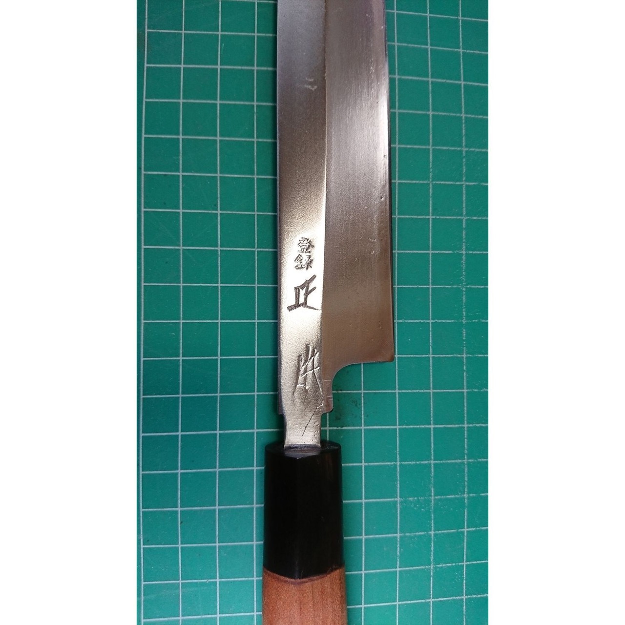 1. o2640/状態:中古/銘:正本/刺身包丁(片刃 右利き用)/刃長:280/峰厚 アゴ上:4.3/重量:185/作り:鋼 水牛柄/他: