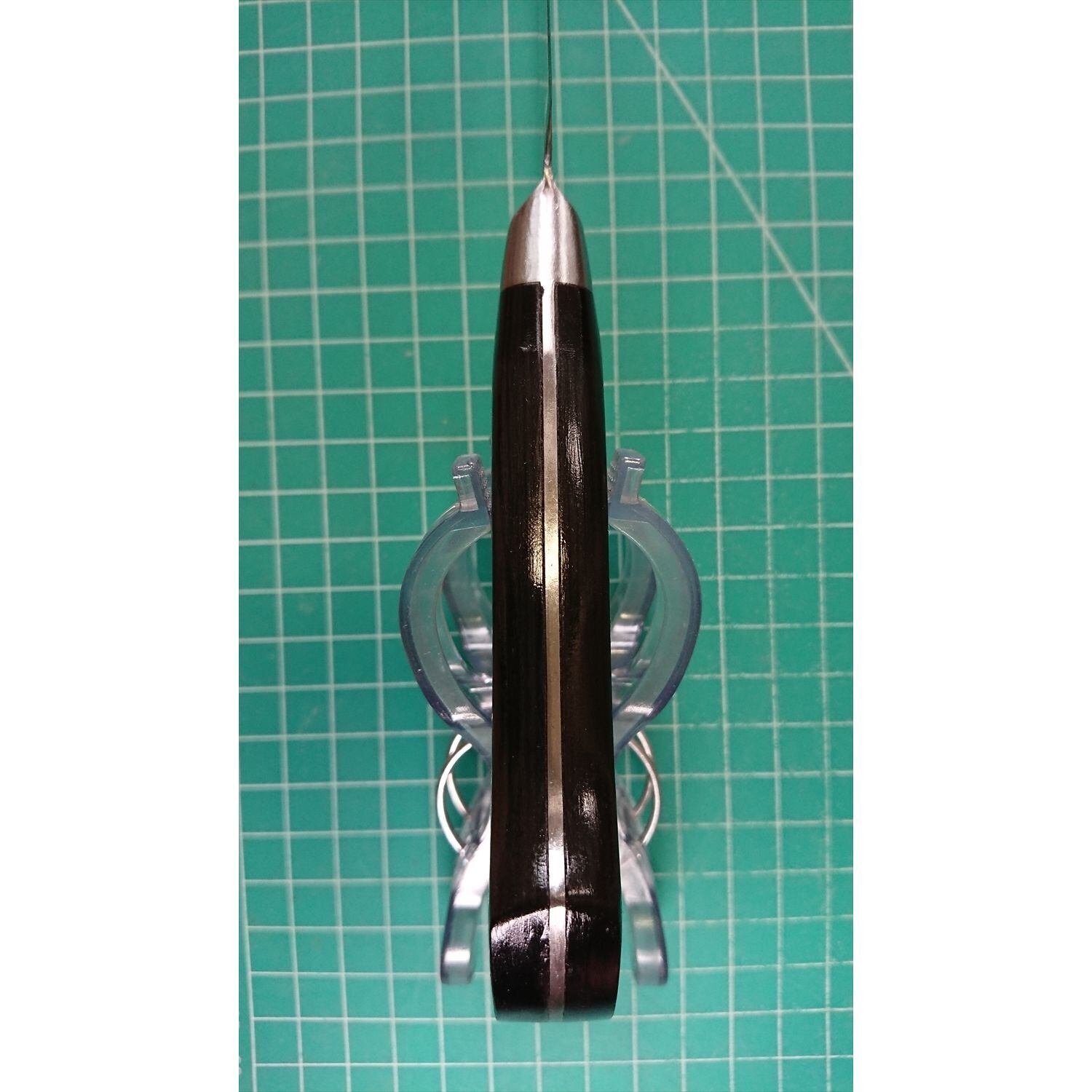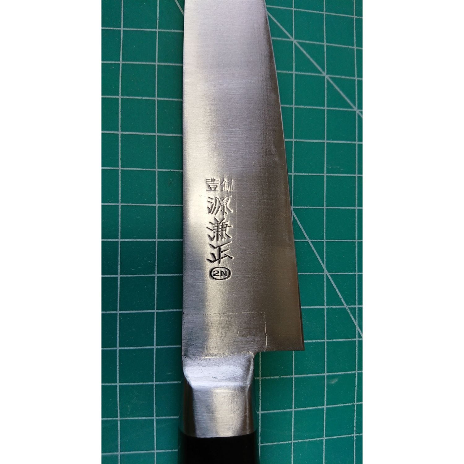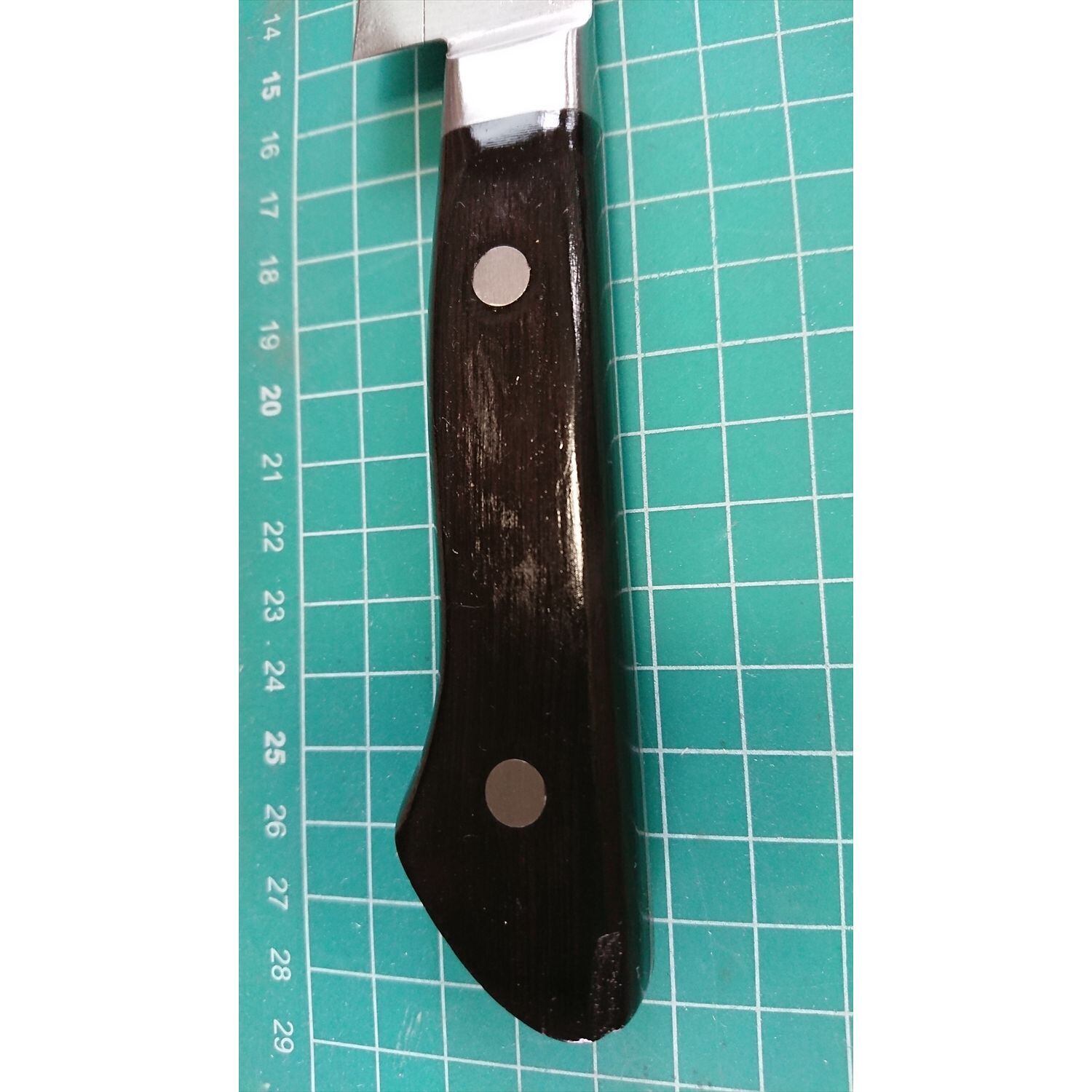 1. o2688/状態:中古/銘:源兼正/牛刀(両刃 左5:右5 右利き・左利き兼用)/刃長:160/峰厚 アゴ上:1.6/重量:122/作り:鋼/他:ツバの根元から柄全体にかけて樹脂コーティング済み(防サビの為)