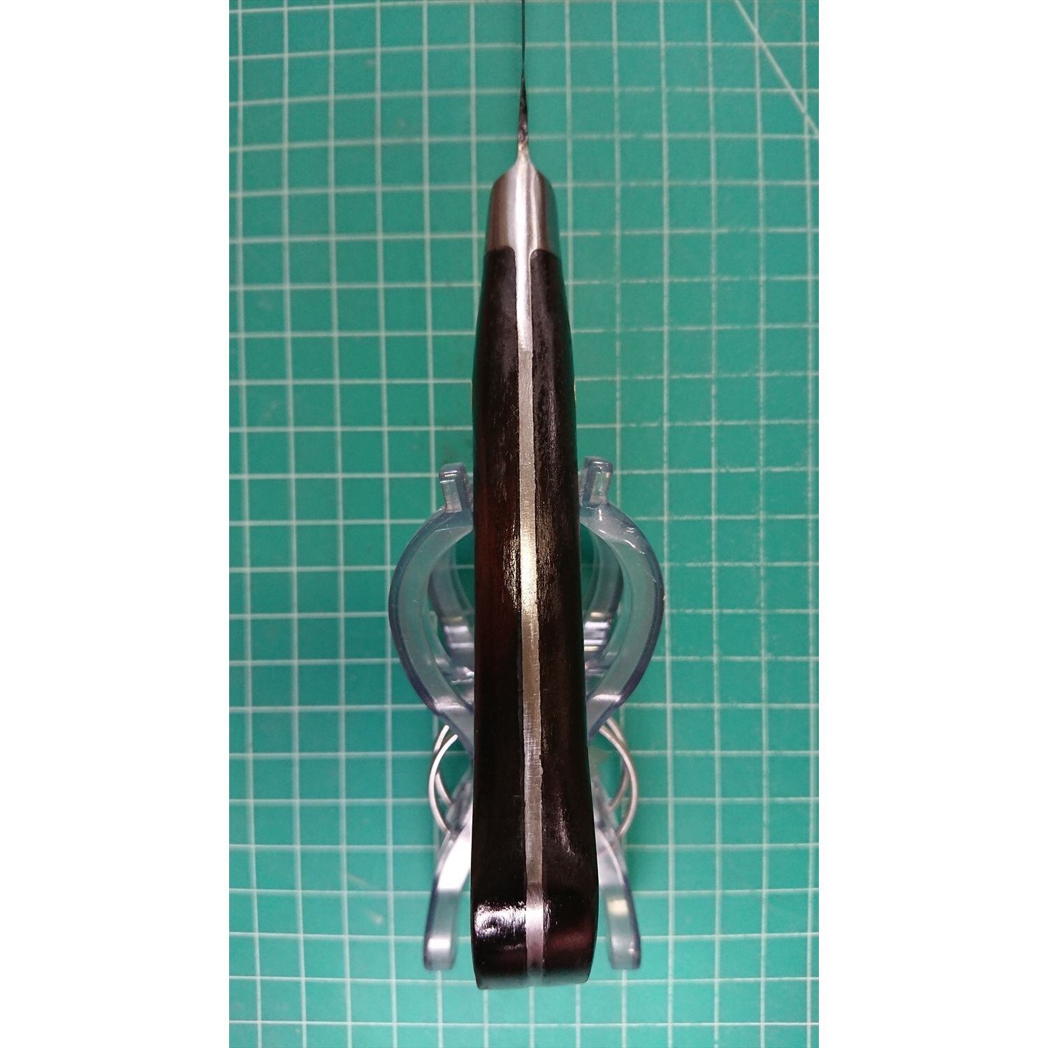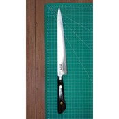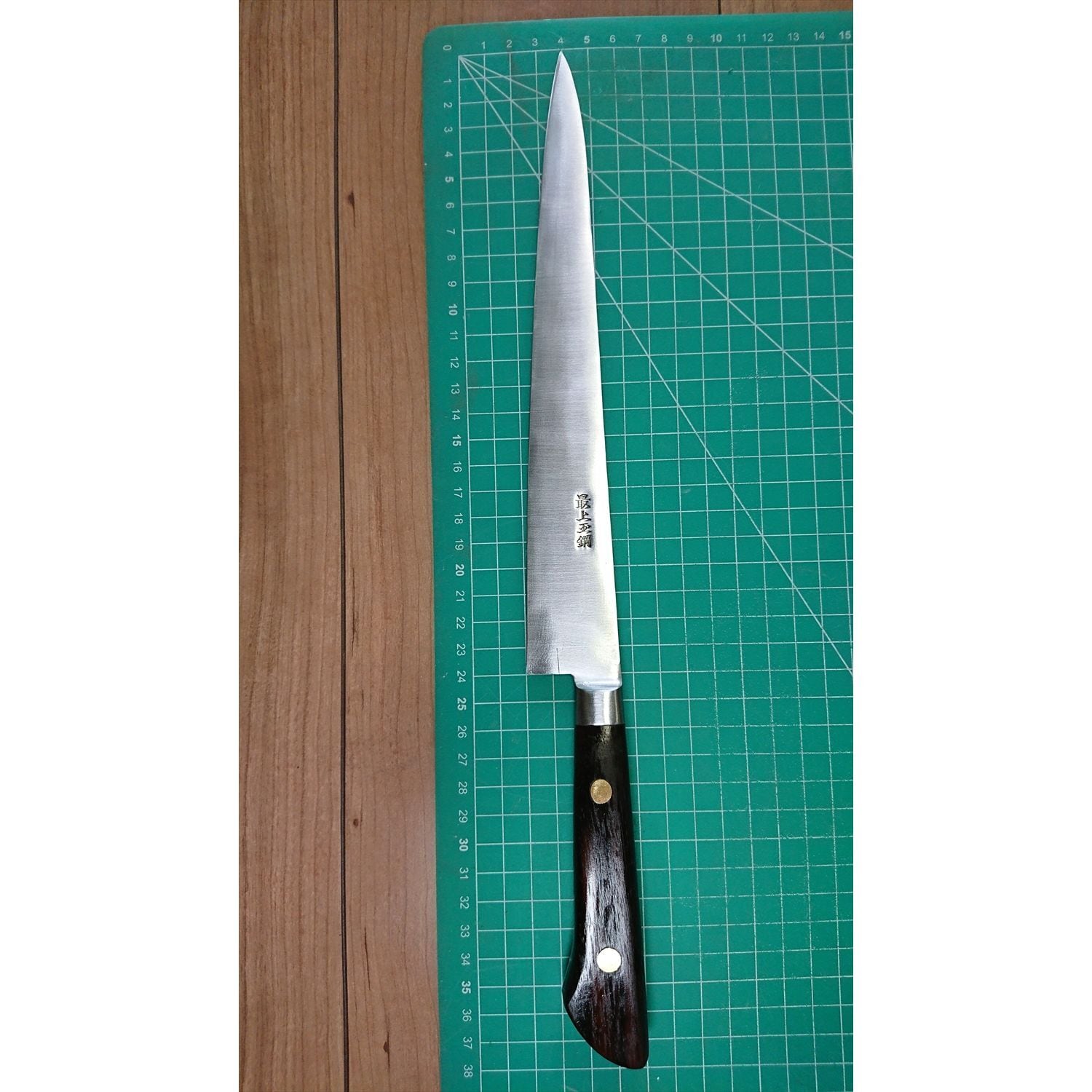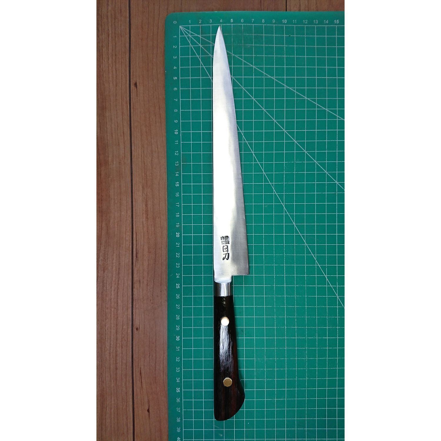 1. o2692/状態:中古/銘:白刀/筋引包丁(両刃 左5:右5 右利き・左利き兼用)/刃長:240/峰厚 アゴ上:2/重量:159/作り:最上玉鋼/他:柄に少々隙間があったため当社にて補修済み。ツバの根元から柄全体にかけて樹脂コーティング済み(防サビの為)