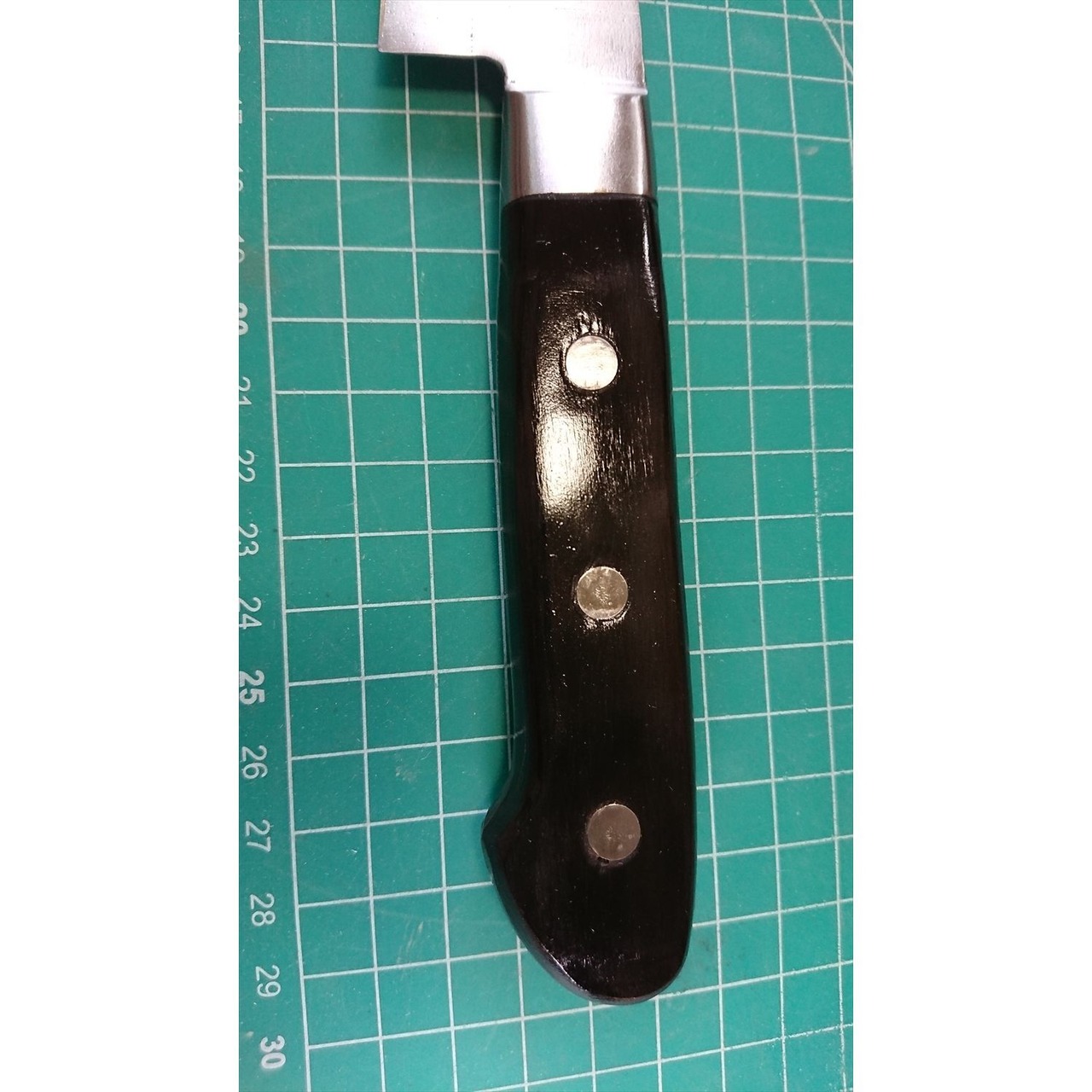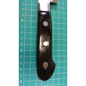 1. o2718/状態:中古/銘:関孫六 銀牛/牛刀(両刃 左5:右5 右利き・左利き兼用)/刃長:165/峰厚 アゴ上:1.4/重量:122/作り:本鋼/他:柄はオーバーホール済み(リベットは新品交換済み)。ツバの根元から柄全体にかけて樹脂コーティング済み(防サビの為)
