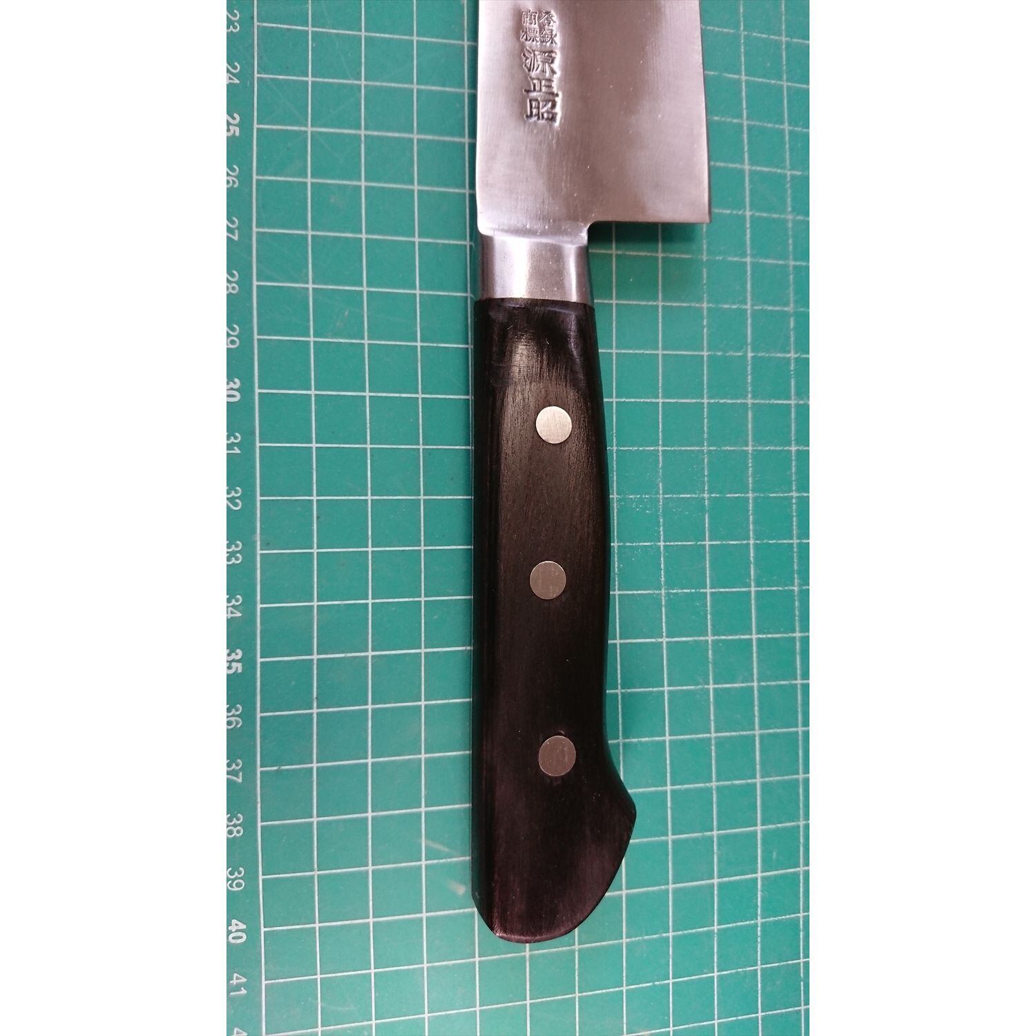 1. o2676/状態:中古/銘:源正昭/牛刀(両刃 左5:右5 右利き・左利き兼用)/刃長:265/峰厚 アゴ上:1.8/重量:210/作り:鋼/他: