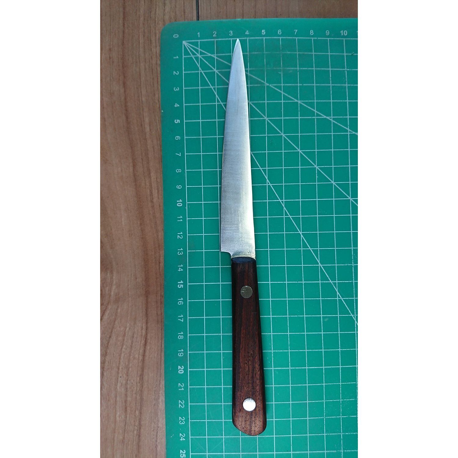 1. o2709/状態:中古/銘:有次/ペティナイフ(両刃 左5:右5 右利き・左利き兼用/刃長:130/峰厚 アゴ上:1.6/重量:51/作り:鋼 別打/他:銘はほぼ消滅