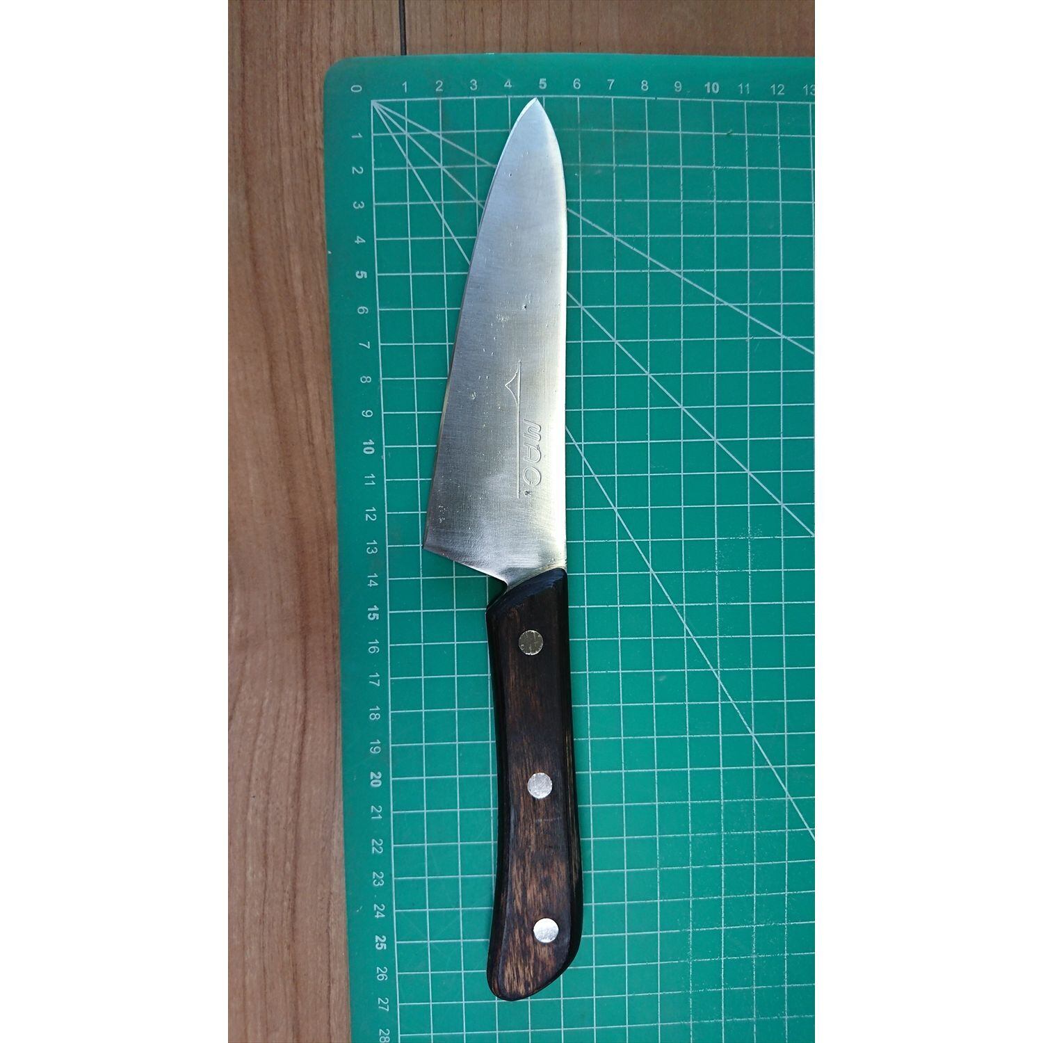 1. o2714/状態:中古/銘:MAC/洋出刃包丁(両刃 左5:右5 右利き・左利き兼用)/刃長:130/峰厚 アゴ上:2.7/重量:162/作り:鋼/他: