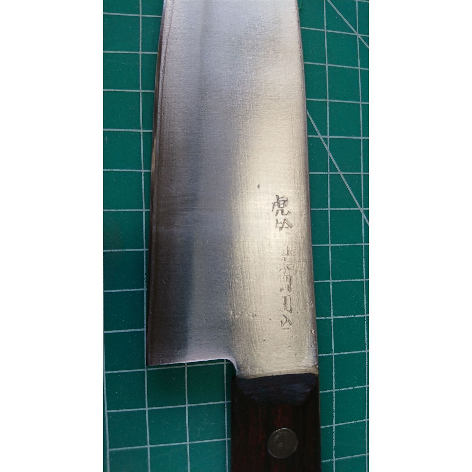 1. o2715/状態:中古/銘:虎於/洋出刃包丁(両刃 左5:右5 右利き・左利き兼用)/刃長:160/峰厚 アゴ上:3.1/重量:146/作り:特殊鋼割込(鋼をステンレスでサンド)/他:
