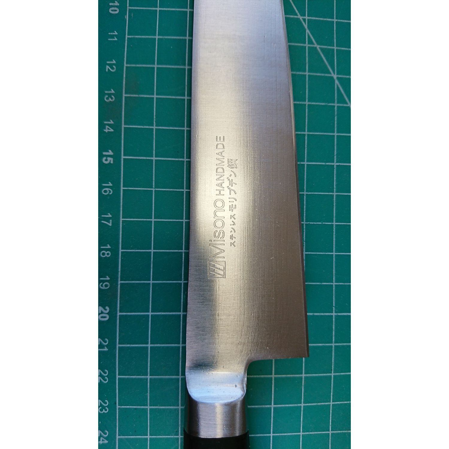 1. o2720/状態:中古/銘:Misono(ミソノ)/牛刀(両刃 左5:右5 右利き・左利き兼用)/刃長:210/峰厚 アゴ上:2.1/重量:154/作り:HANDMADE ステンレスモリブデン鋼/他: