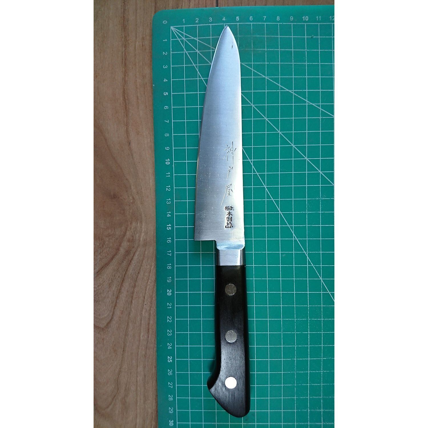 1. o2734/状態:中古/銘:神戸屋/三徳包丁(両刃 左5:右5 右利き・左利き兼用)/刃長:165/峰厚 アゴ上:1.9/重量:164/作り:極上 本割込D.P(鋼をステンレスでサンド)/他: