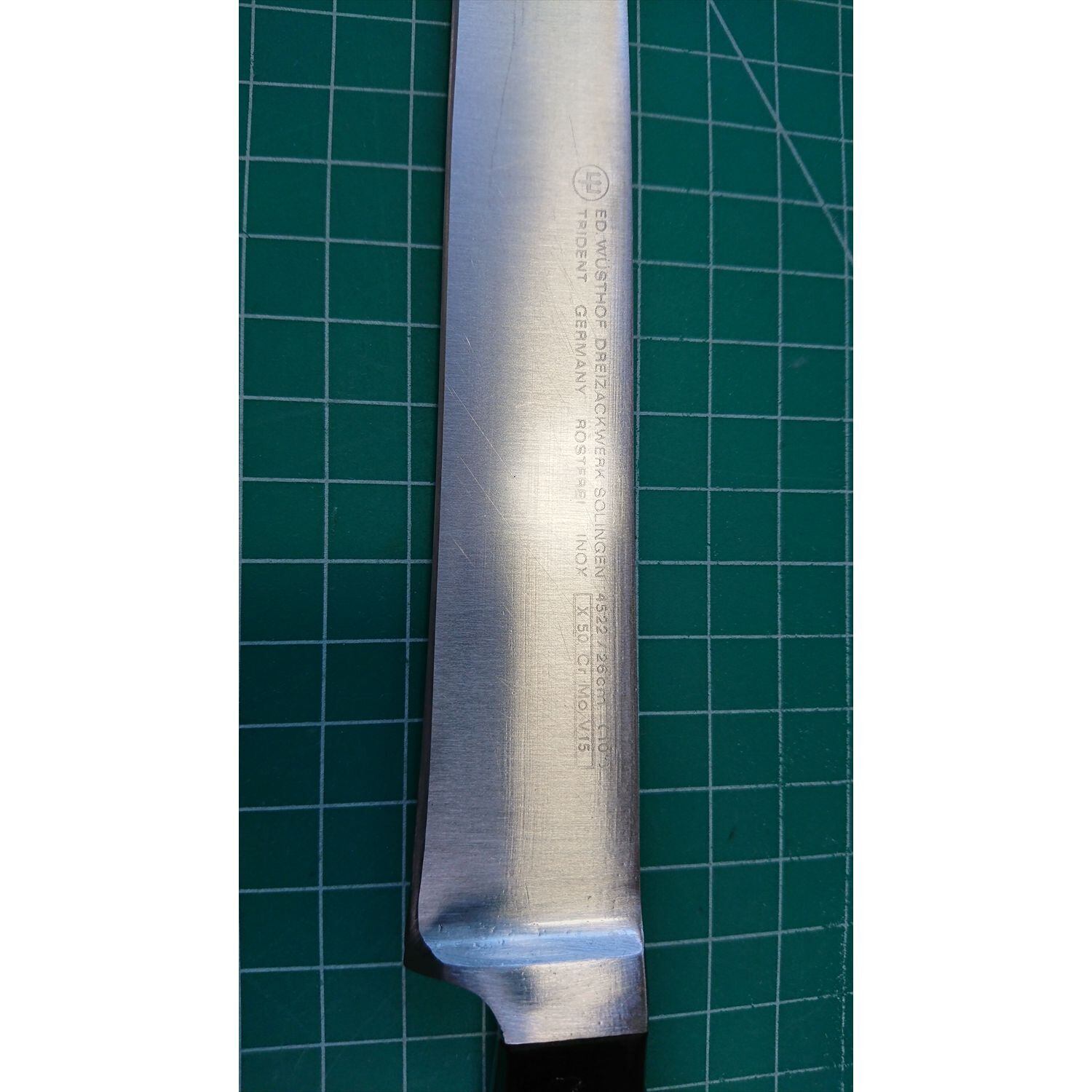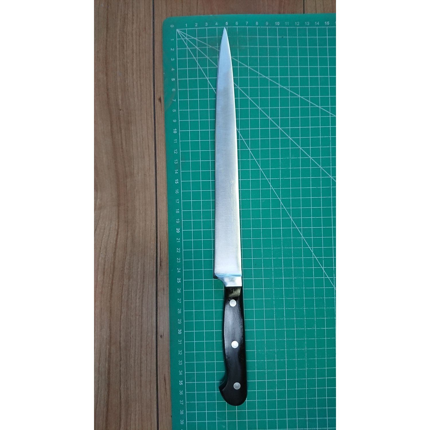 1. o2739/状態:中古/銘:WUSTHOF(ヴォストフ)/筋引包丁(両刃 左5:右5 右利き・左利き兼用)/刃長:245/峰厚 アゴ上:2.3/重量:147/作り:INOX(ステンレス系)/他: