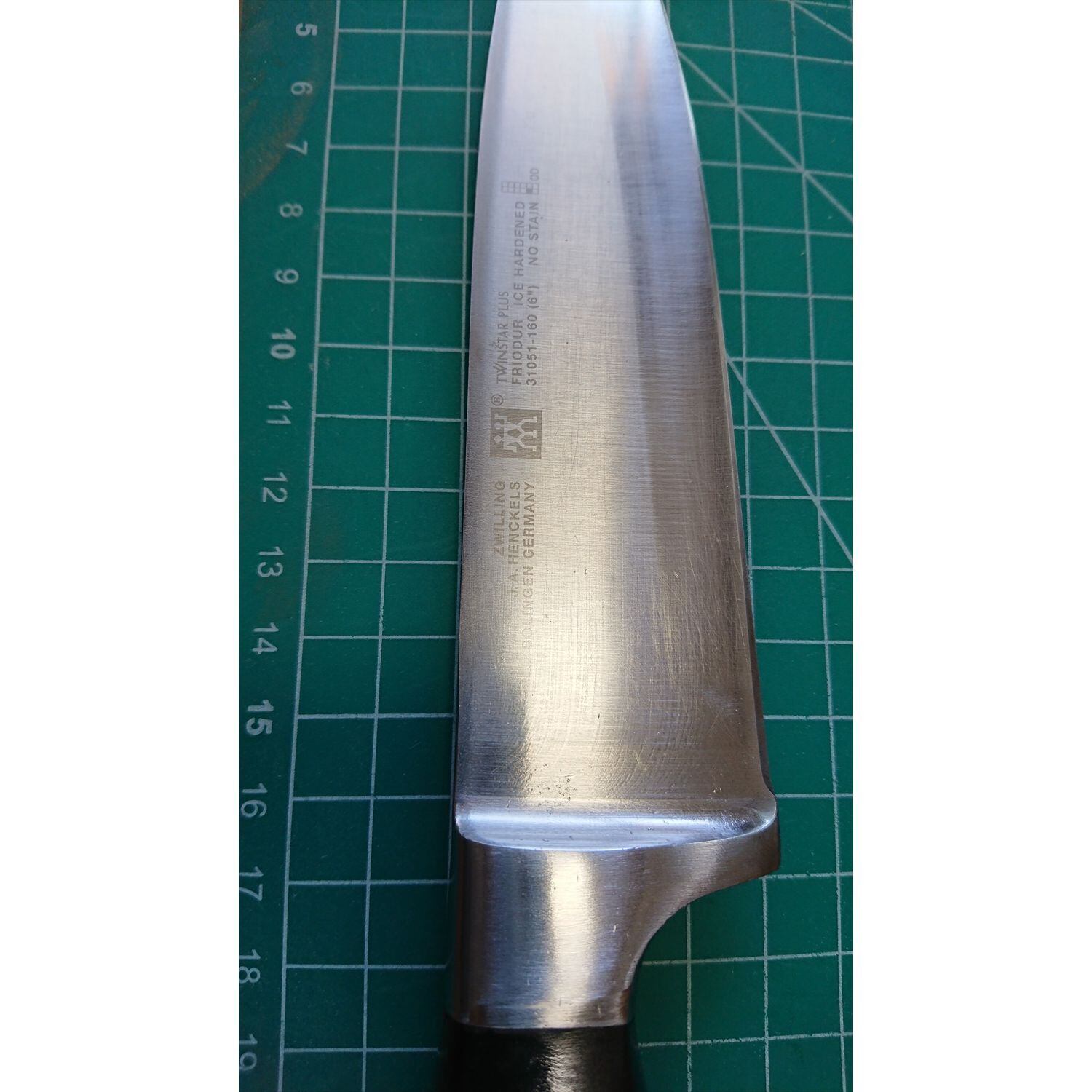 1. o2759/状態:中古/銘:ヘンケルス SOLINGEN GERMANY TWINSTAR PLUS/牛刀(両刃 左5:右5 右利き・左利き兼用)/刃長:160/峰厚 アゴ上:3.4/重量:196/作り:ICE HARDENED NO STAIN/他: