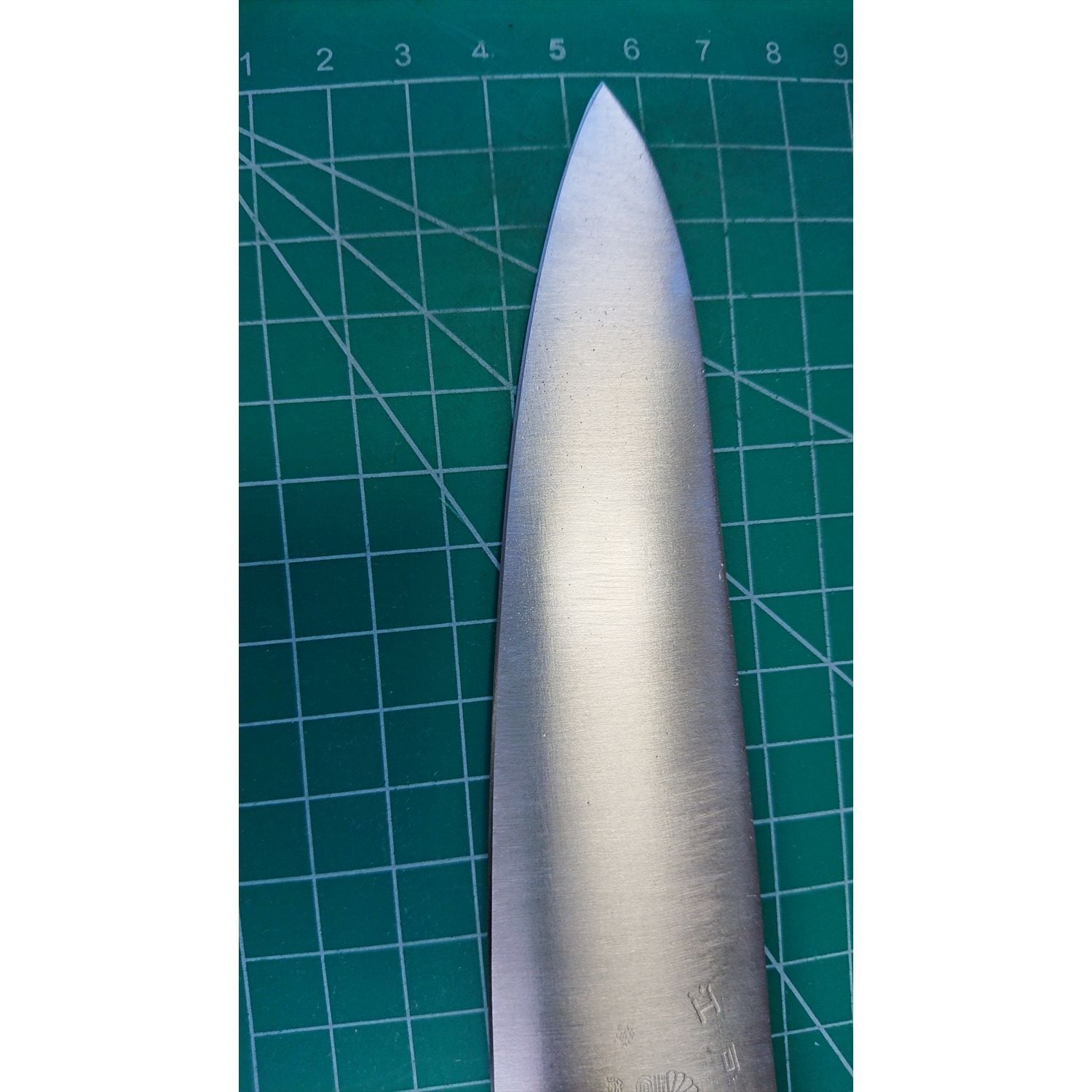 1. o2777/状態:中古/銘:江戸菊水/牛刀(両刃 左5:右5 右利き・左利き兼用)/刃長:180/峰厚 アゴ上:1.4/重量:73/作り:ステンレス系/他:柄はオーバーホール済み(リベットは新品交換済み)。