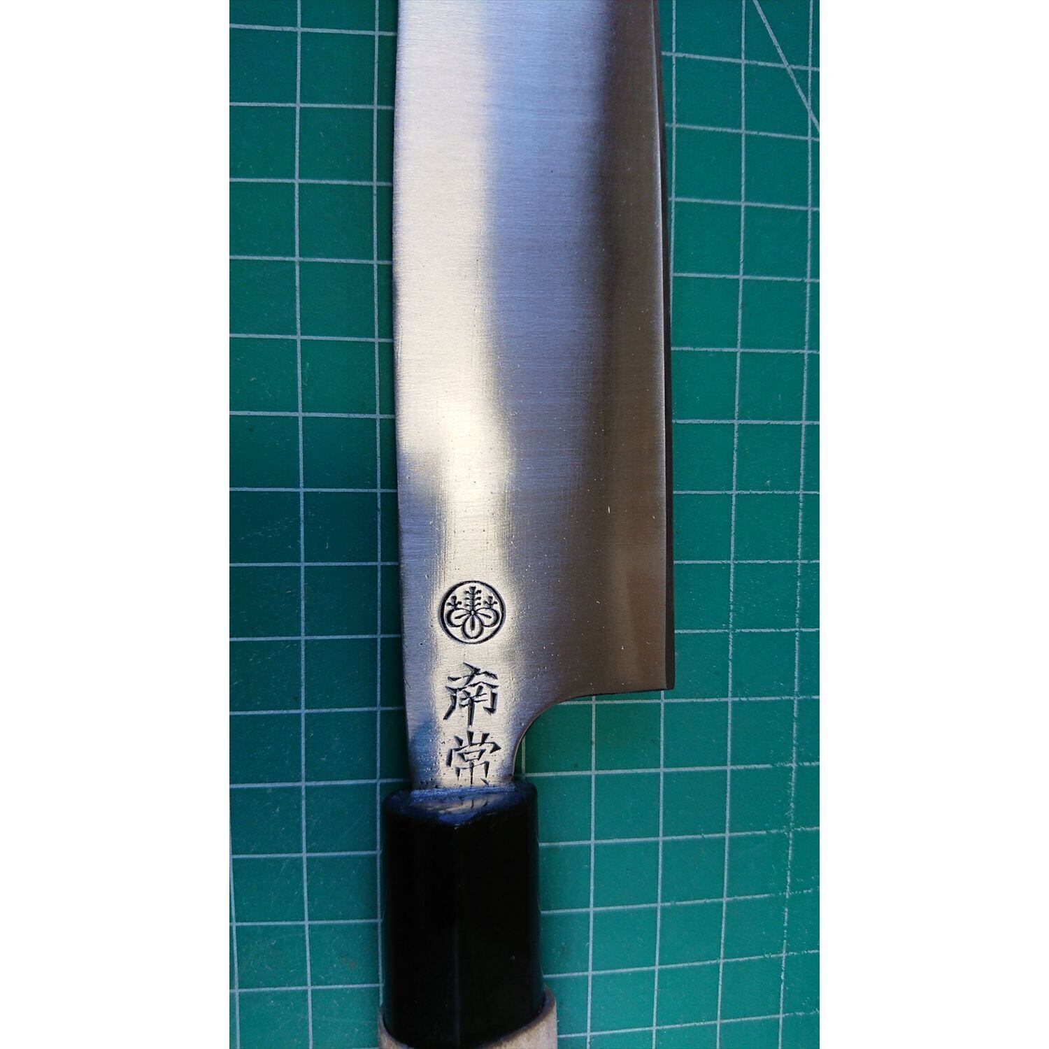 1. o2790/状態:中古/銘:南常/牛刀(両刃 約 左1:右9 右利き用)/刃長:235/峰厚 アゴ上:1.5/重量:109/作り:鋼/他:柄は新品と交換済み