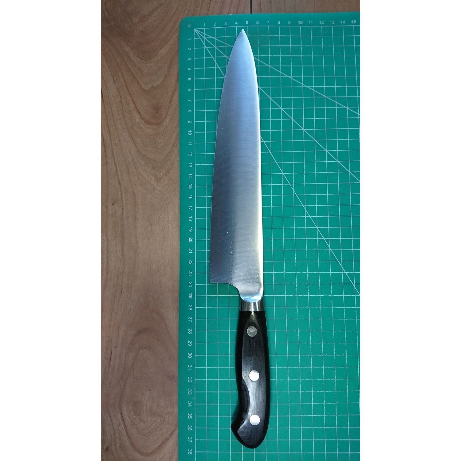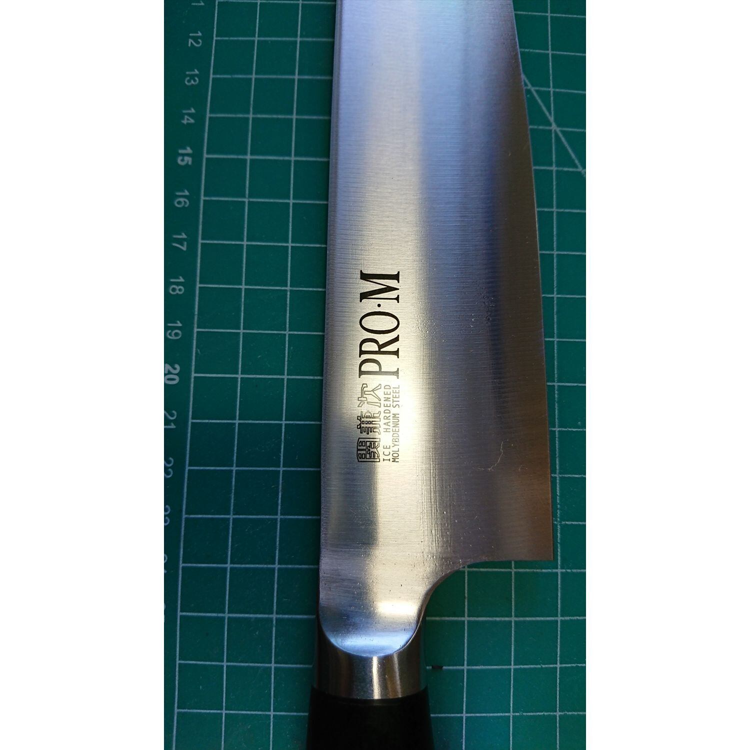 1. o2913/状態:中古/銘:関兼次 PRO・M/牛刀(両刃 左5:右5 右利き・左利き兼用)/刃長:240/峰厚 アゴ上:2/重量:192/作り:ICE HARDENED MOLYBDENUM STEEL/他:
