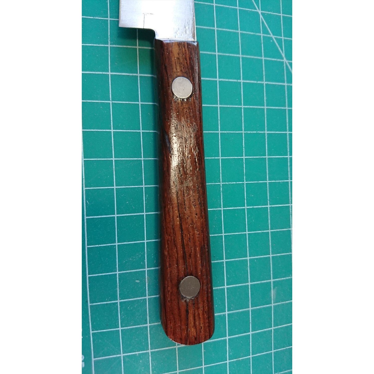 1. o2831/状態:中古/銘:國秀/ペティナイフ(両刃 左5:右5 右利き・左利き兼用)/刃長:135/峰厚 アゴ上:1.7/重量:61/作り:鋼/他:柄はオーバーホール済み(リベットは新品交換済み)。ツバの根元から柄全体にかけて樹脂コーティング済み(防サビの為)