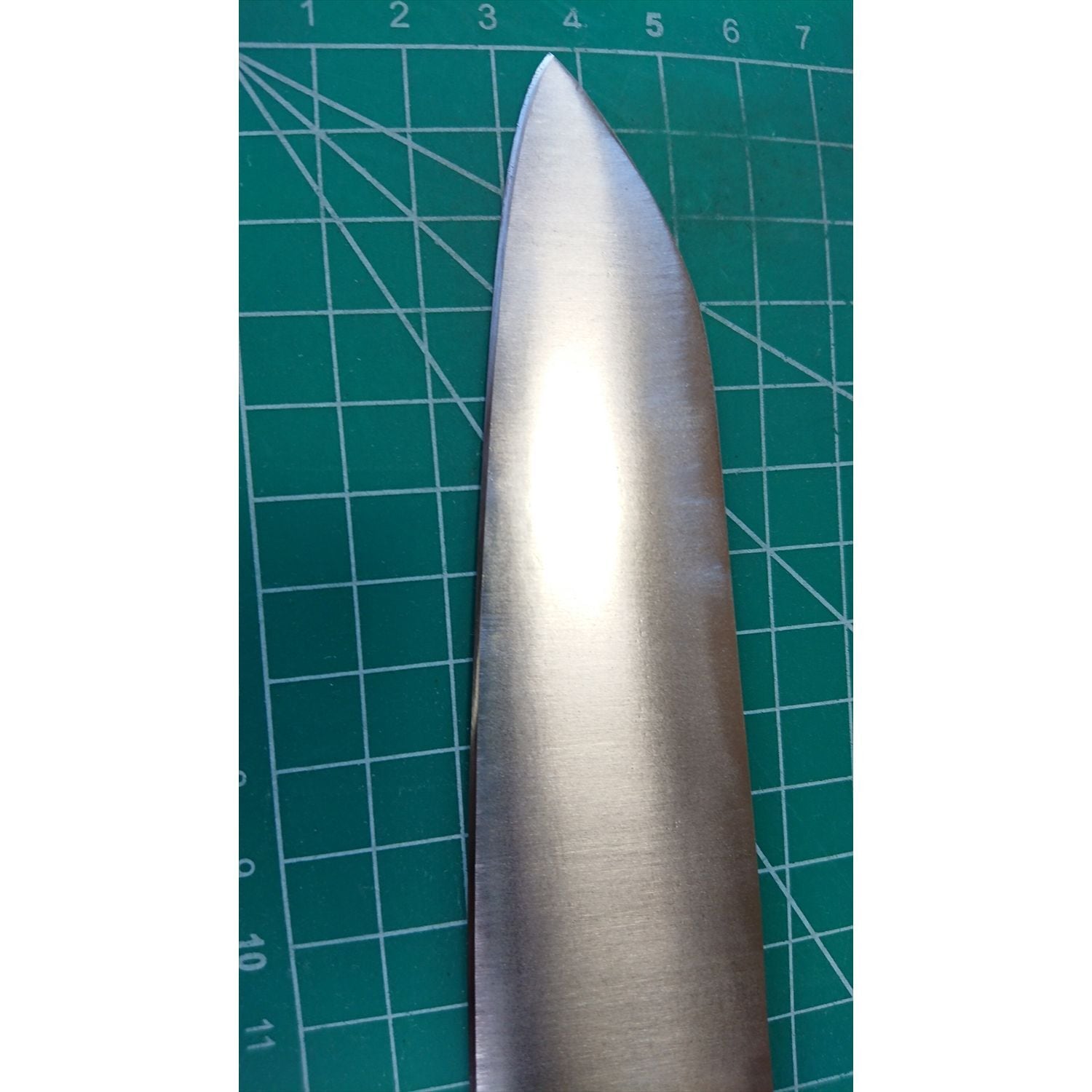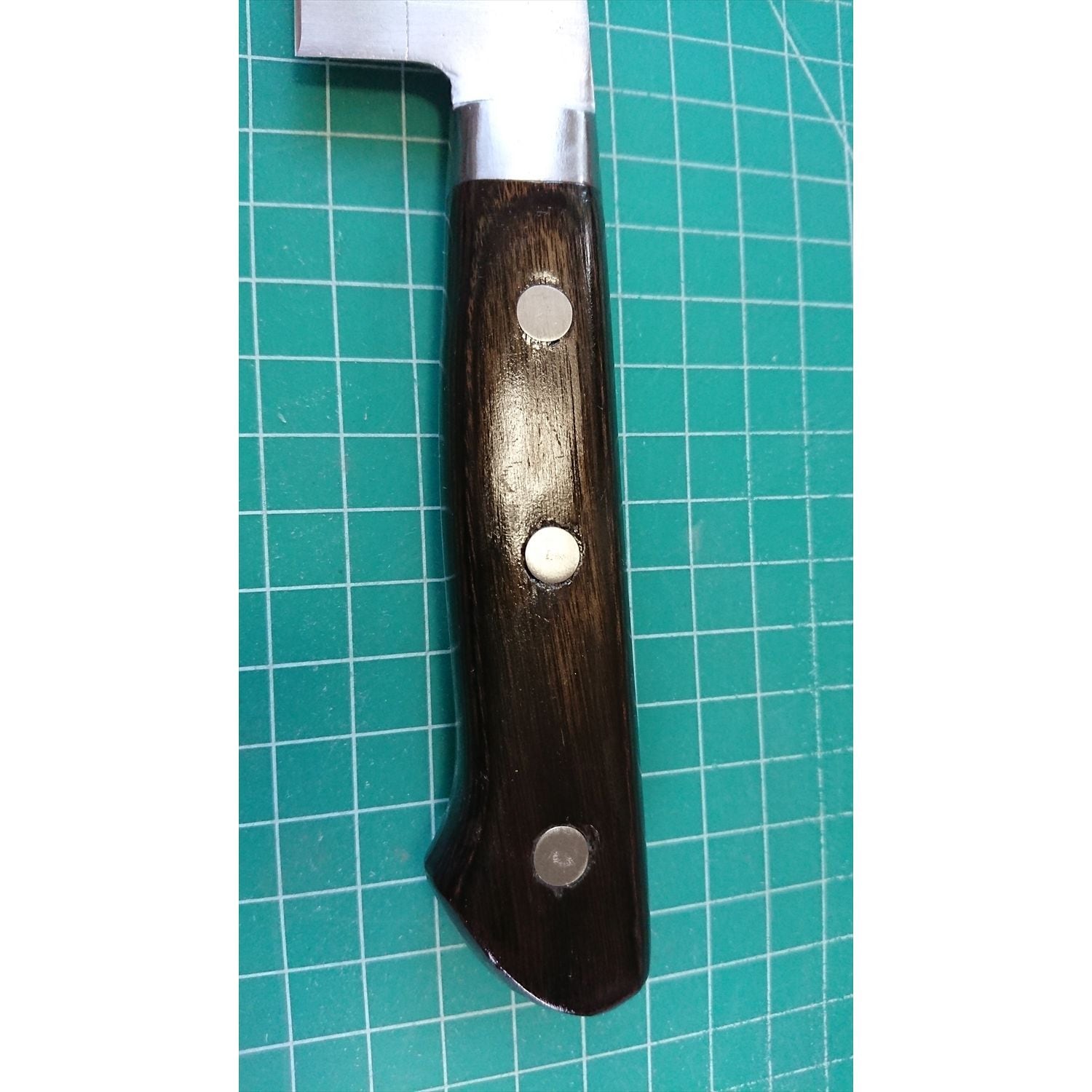 1. o2832/状態:中古/銘:木屋利光/牛刀(両刃 左5:右5 右利き・左利き兼用)/刃長:175/峰厚 アゴ上:1.6/重量:130/作り:鋼/他:柄はオーバーホール済み(リベットは新品交換済み)。ツバの根元から柄全体にかけて樹脂コーティング済み(防サビの為)