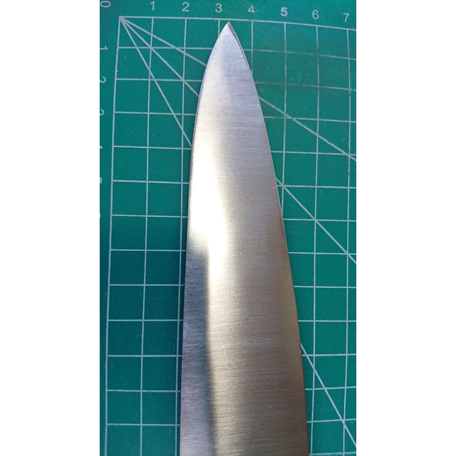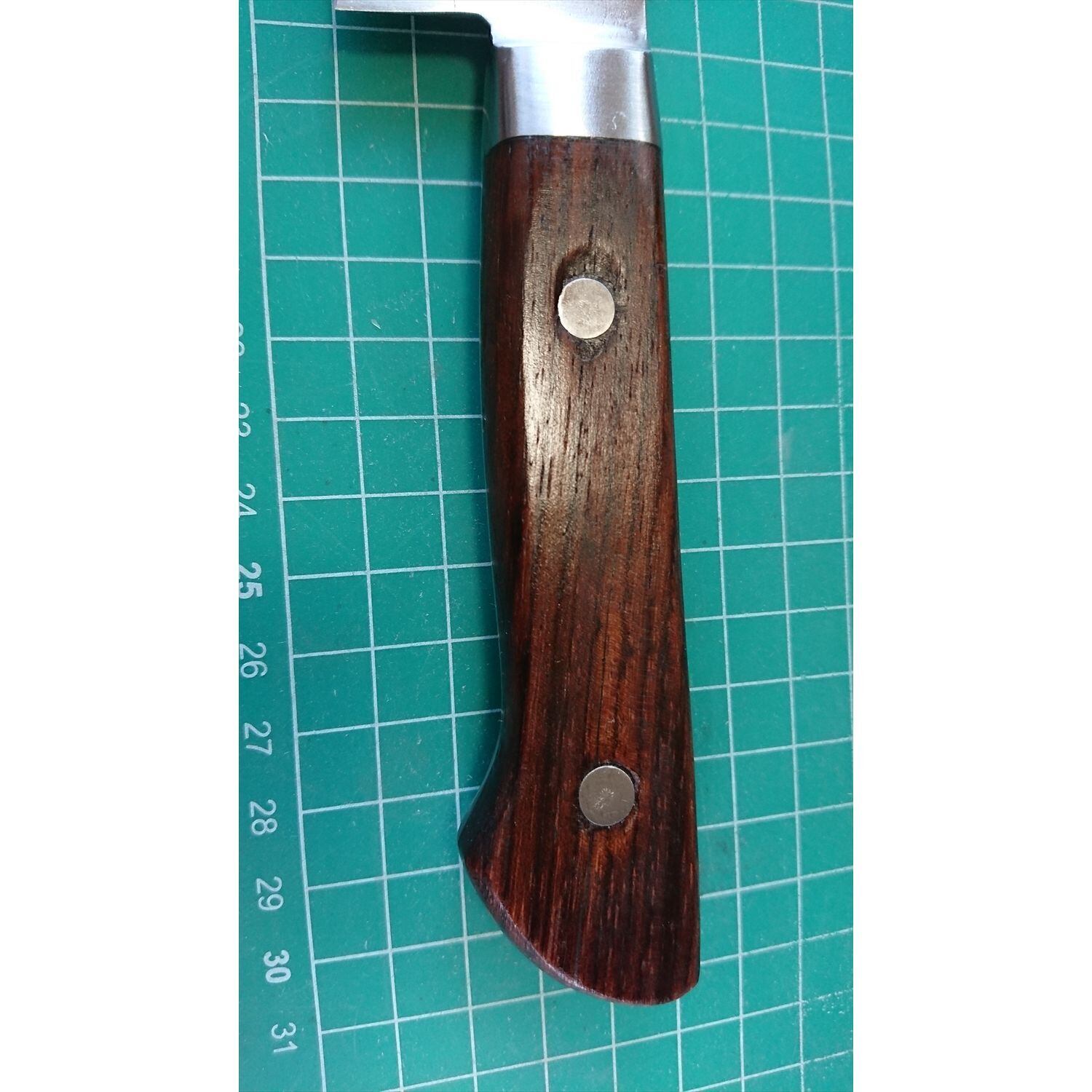 1. o2833/状態:中古/銘:康徹?/牛刀(両刃 左5:右5 右利き・左利き兼用)/刃長:180/峰厚 アゴ上:1.6/重量:122/作り:鋼/他:柄はオーバーホール済み(リベットは新品交換済み)。ツバの根元から柄全体にかけて樹脂コーティング済み(防サビの為)