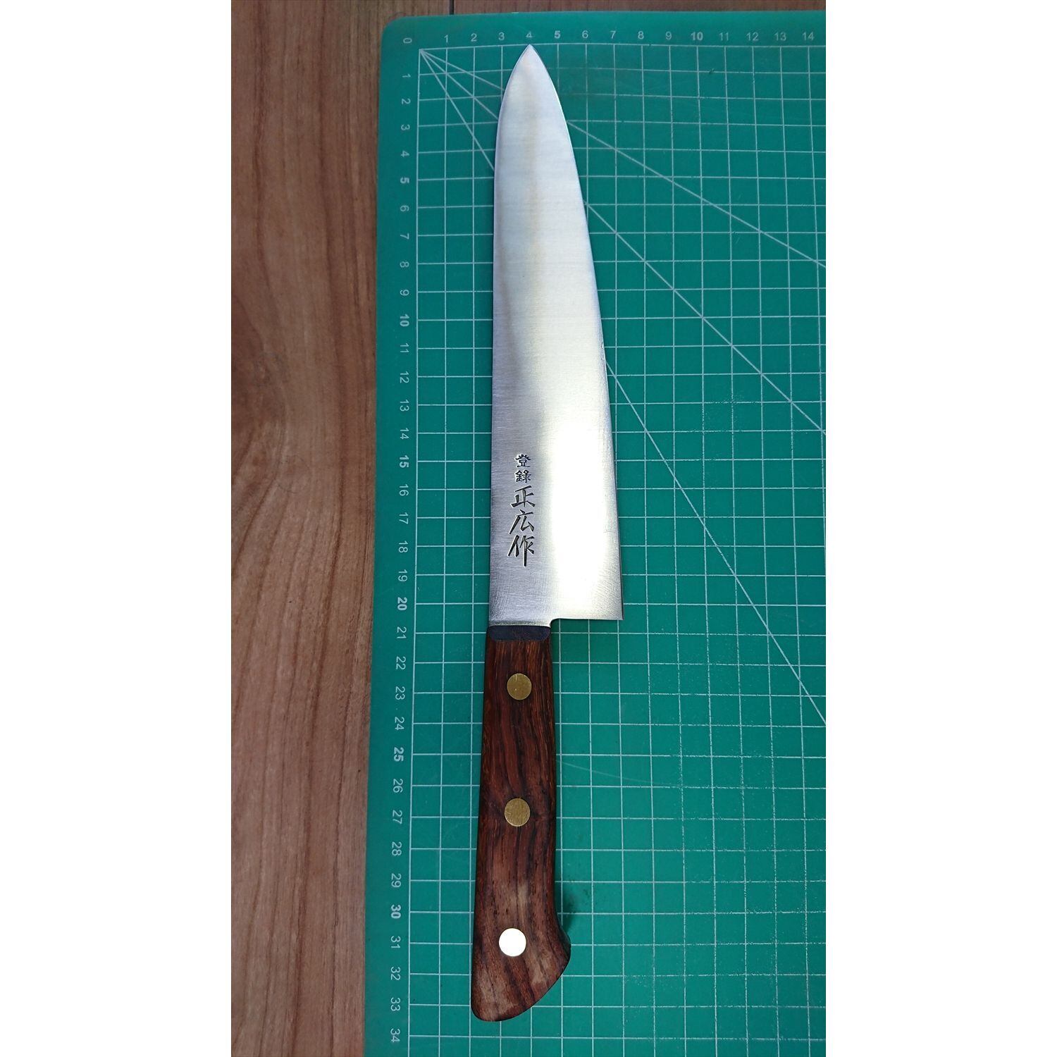 1. o2775/状態:中古/銘:正広/牛刀(両刃 左5:右5 右利き・左利き兼用)/刃長:205/峰厚 アゴ上:1.9/重量:142/作り:鋼/他: