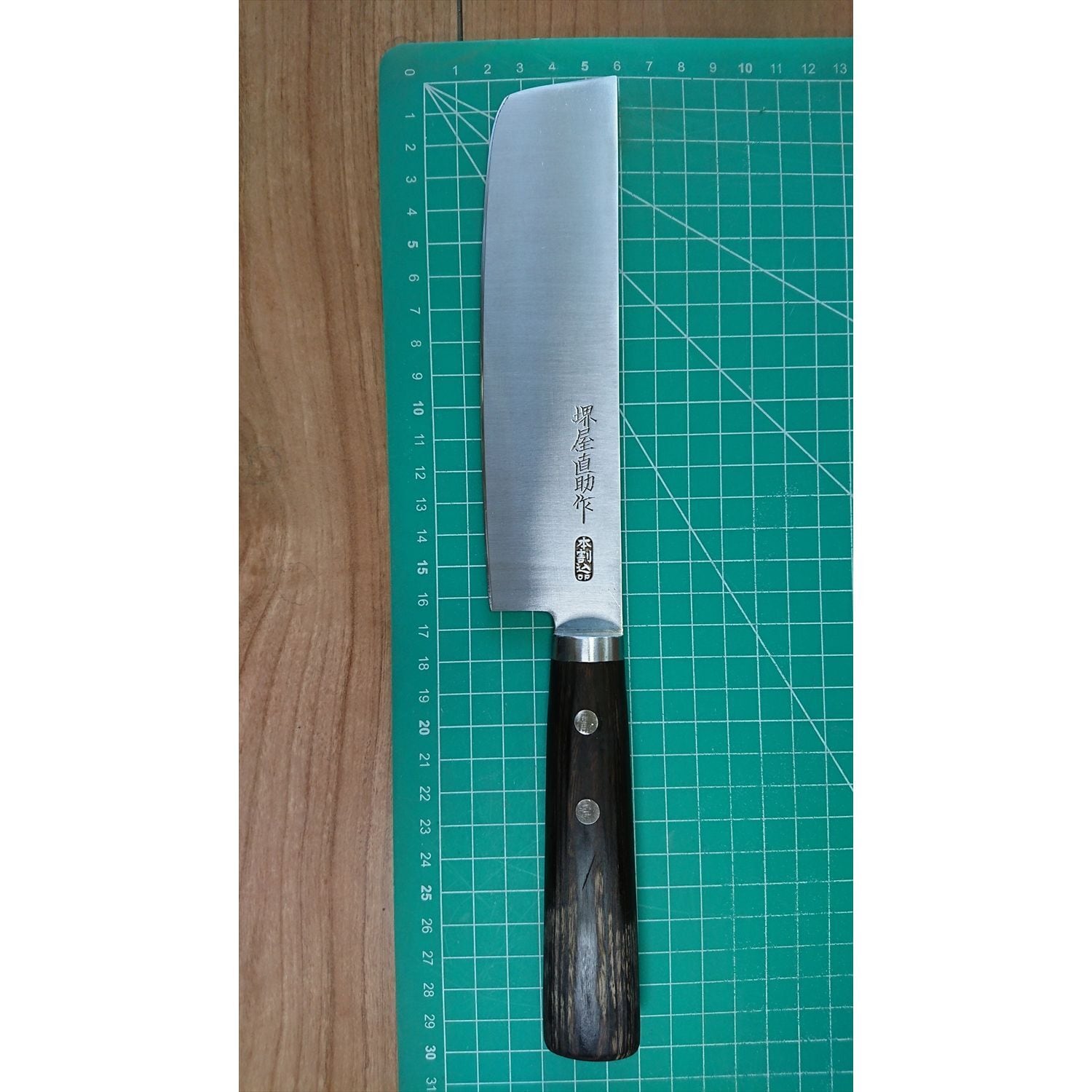 1. o2793/状態:中古/銘:堺屋直助/菜切包丁(両刃 左5:右5 右利き・左利き兼用)/刃長:160/峰厚 アゴ上:1.9/重量:152/作り:本割込DP(鋼をステンレスでサンド)/他: