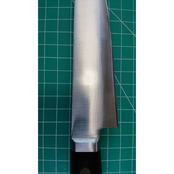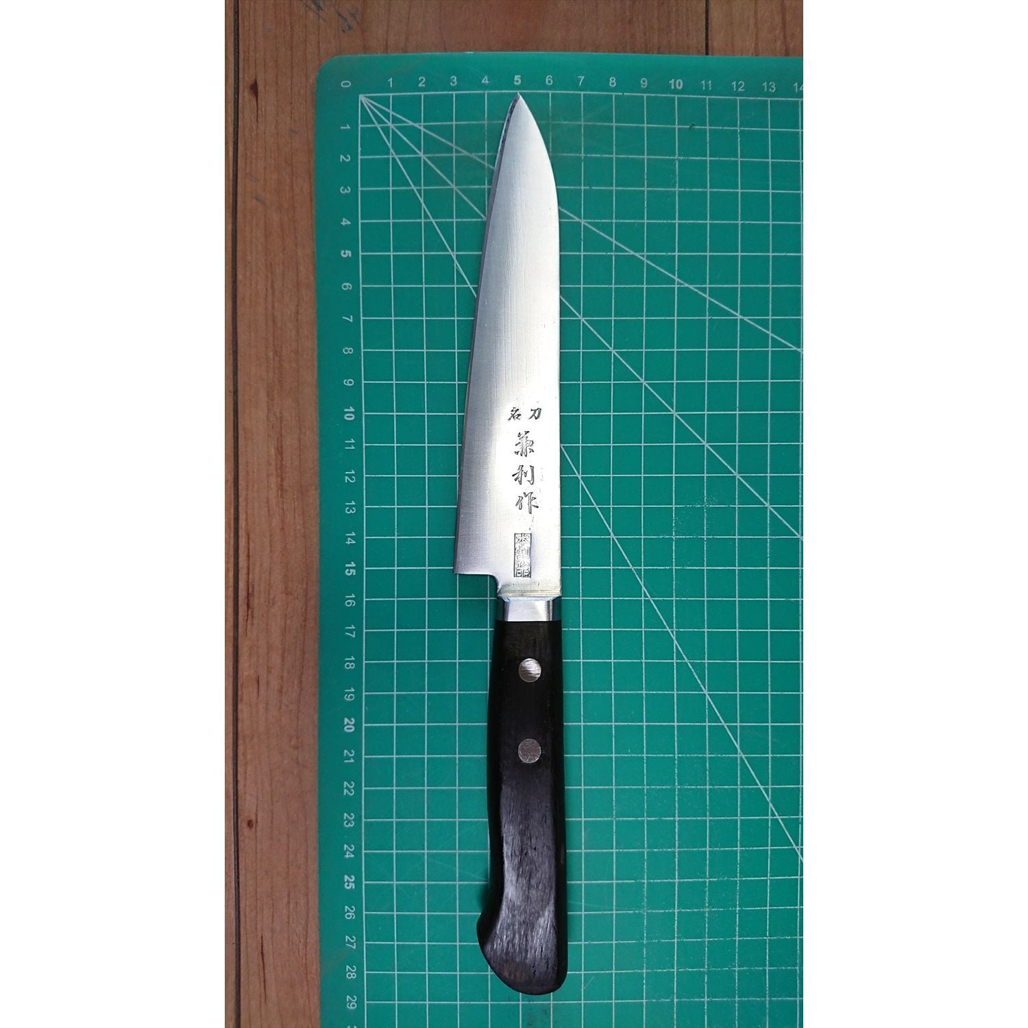 1. o2787/状態:中古/銘:名刀 兼利作/三徳包丁(両刃 左5:右5 右利き・左利き兼用)/刃長:150/峰厚 アゴ上:1.8/重量:120/作り:本割込DP(鋼をステンレスでサンド)/他:
