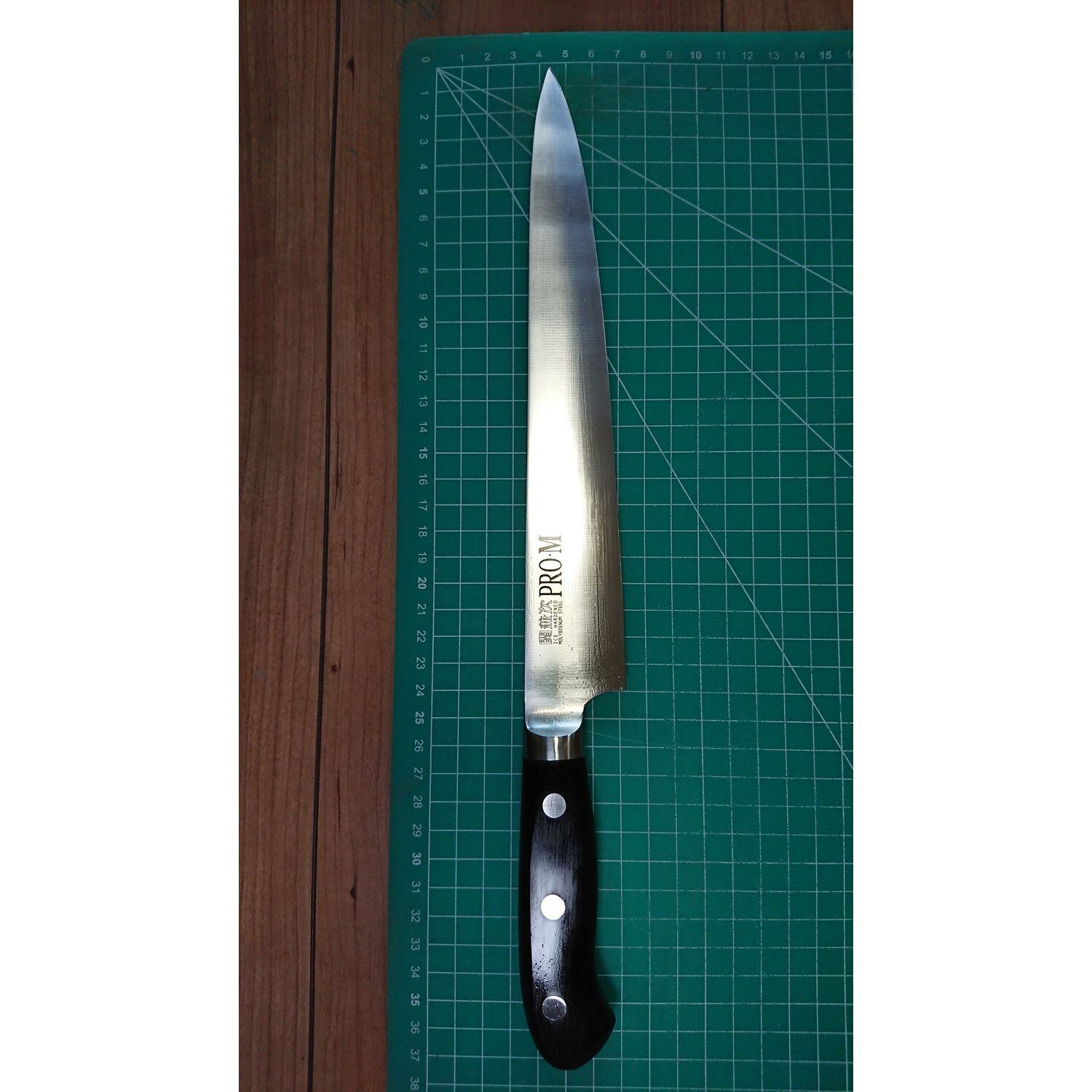 1. o2927/状態:中古/銘:関兼次 PRO・M/筋引包丁(両刃 左5:右5 右利き・左利き兼用)/刃長:240/峰厚 アゴ上:1.8/重量:156/作り:ICE HARDENED MOLYBDENUM STEEL/他: