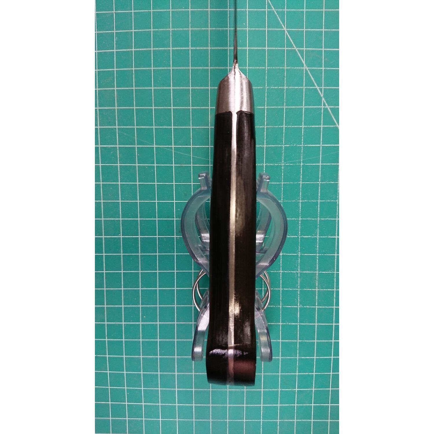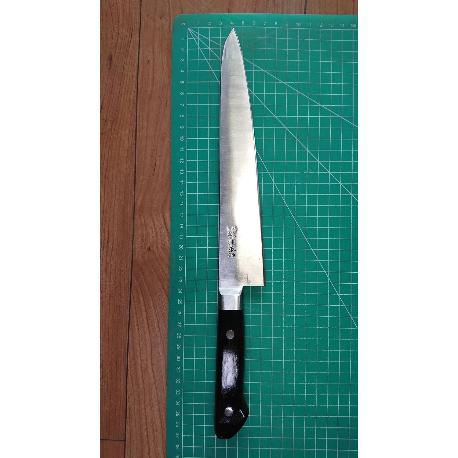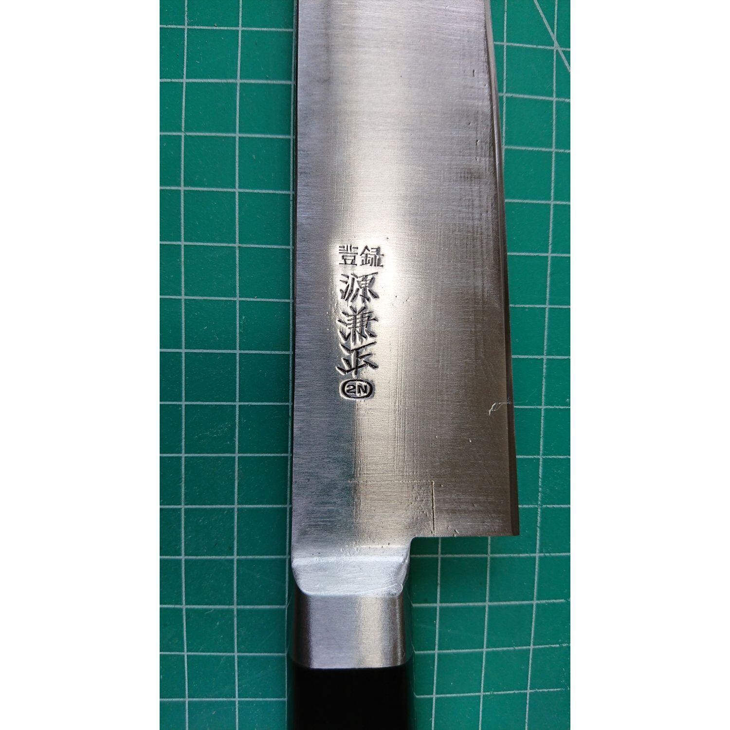 1. o2783/状態:中古/銘:源兼正/牛刀(両刃 約 左1:右9 右利き用)/刃長:235/峰厚 アゴ上:1.9/重量:163/作り:鋼/他:柄はオーバーホール済み(リベットは新品交換済み)。ツバの根元から柄全体にかけて樹脂コーティング済み(防サビの為)