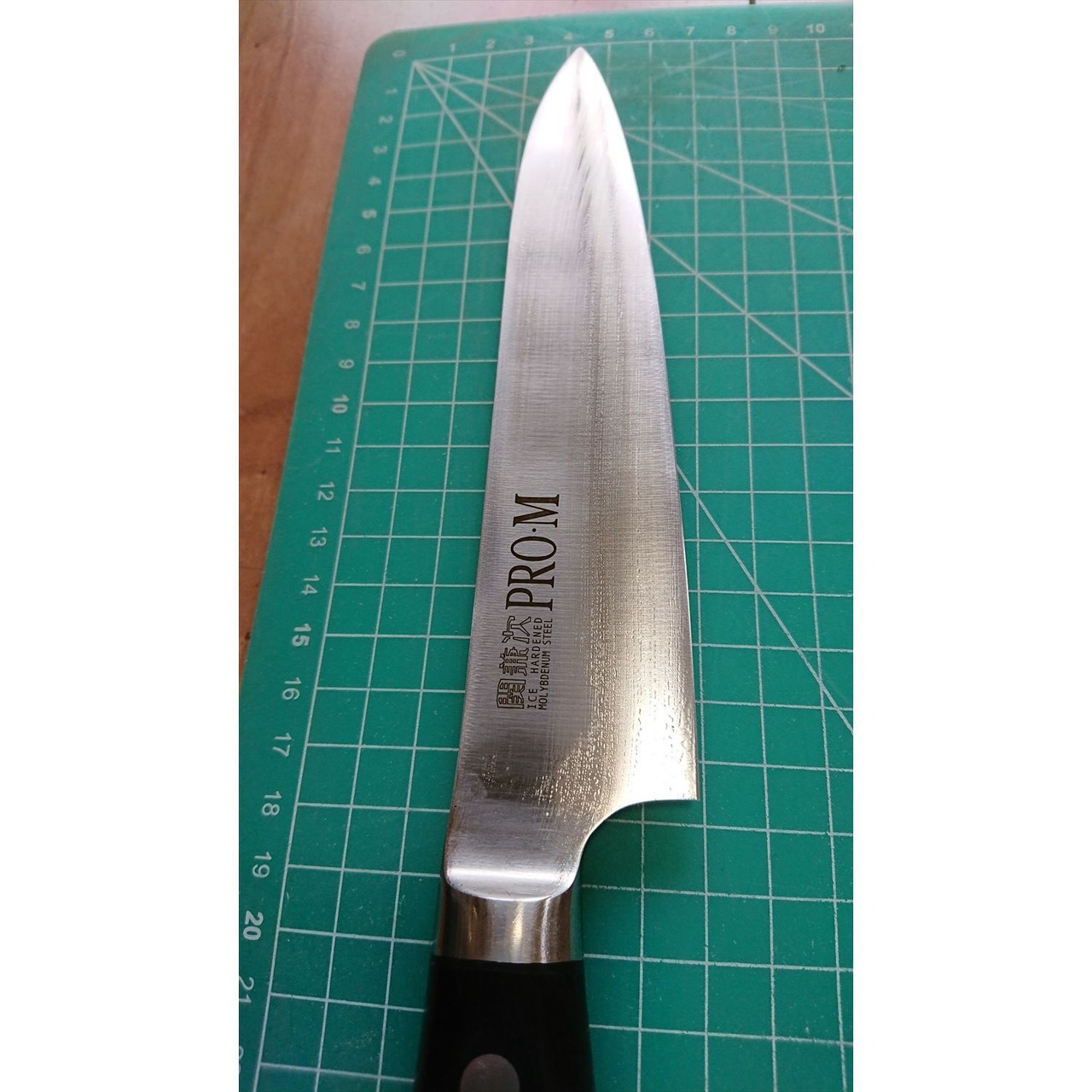 1. o2925/状態:中古/銘:関兼次 PRO・M/牛刀(両刃 左5:右5 右利き・左利き兼用)/刃長:180/峰厚 アゴ上:1.9/重量:144/作り:ICE HARDENED MOLYBDENUM STEEL/他: