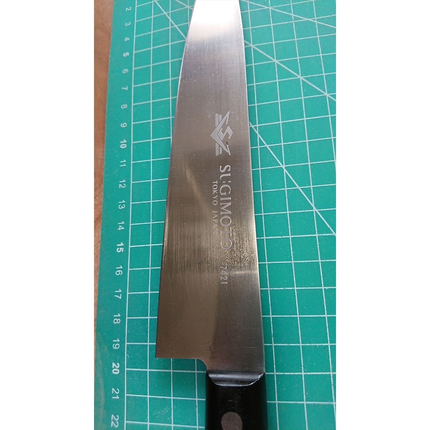 1. o2812/状態:中古/銘:東京杉本7421/牛刀(両刃 左5:右5 右利き・左利き兼用)/刃長:195/峰厚 アゴ上:1.9/重量:144/作り:サビニクイ特殊合金鋼製/他:
