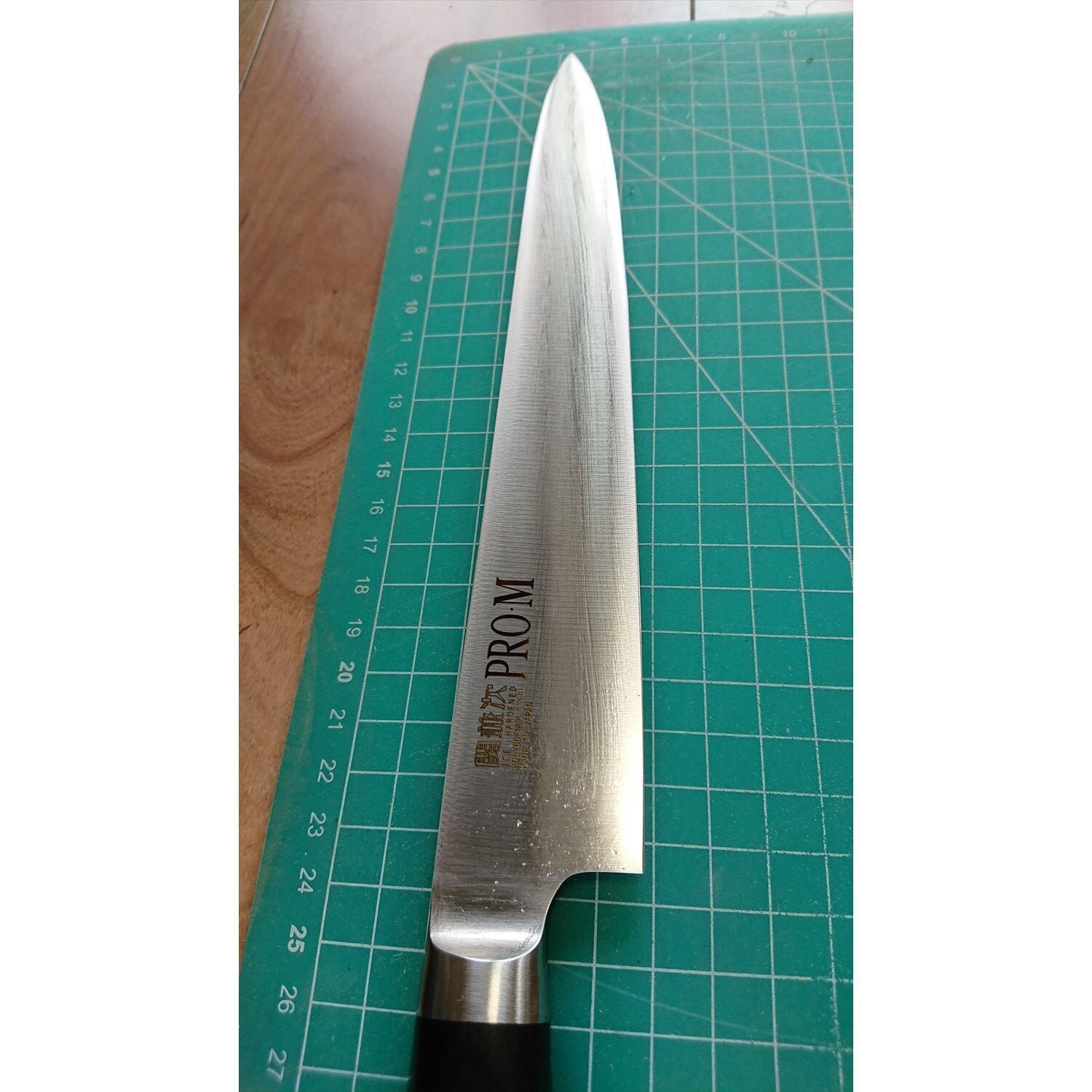 1. o2930/状態:中古/銘:関兼次 PRO・M/筋引包丁(両刃 左5:右5 右利き・左利き兼用)/刃長:240/峰厚 アゴ上:1.9/重量:154/作り:ICE HARDENED MOLYBDENUM STEEL/他: