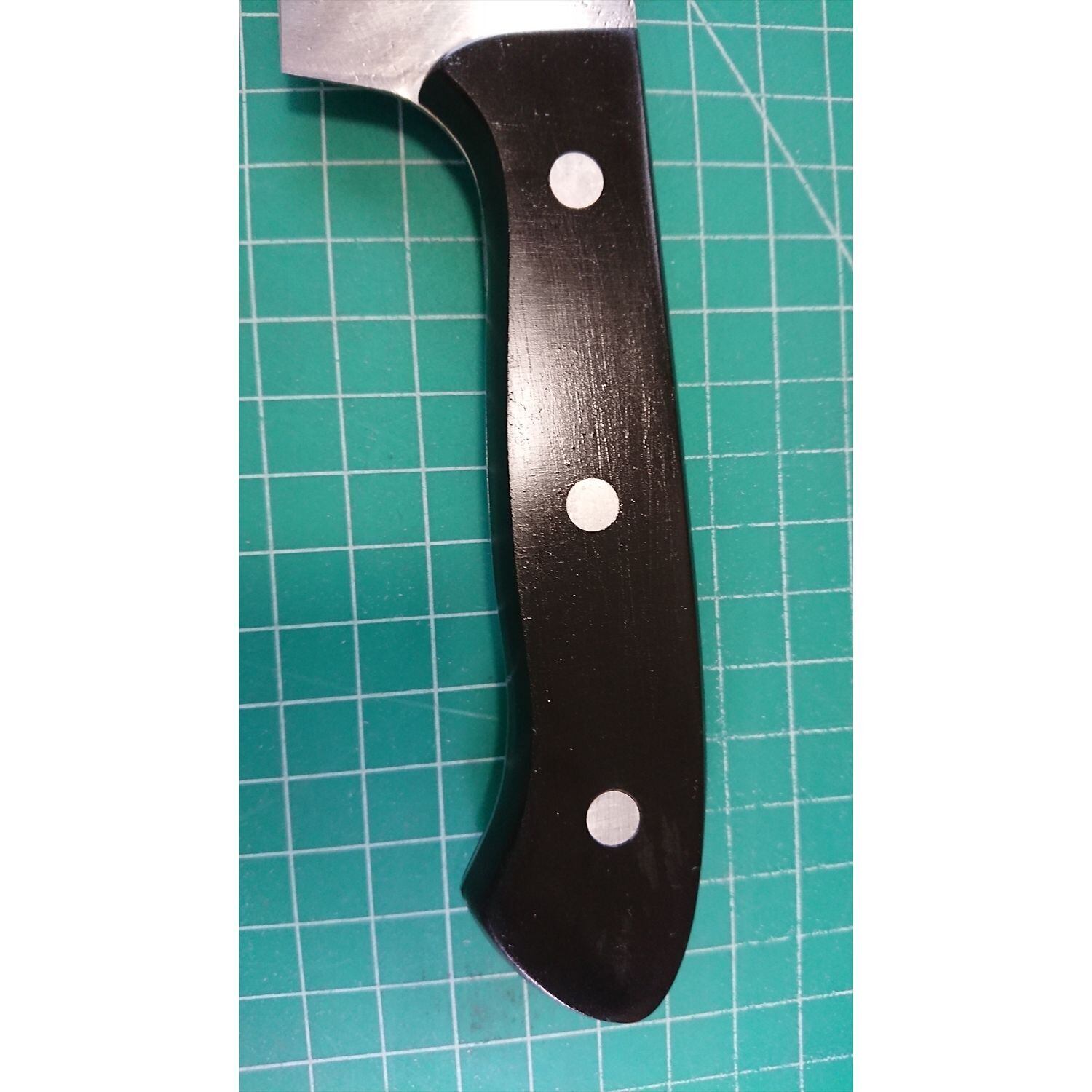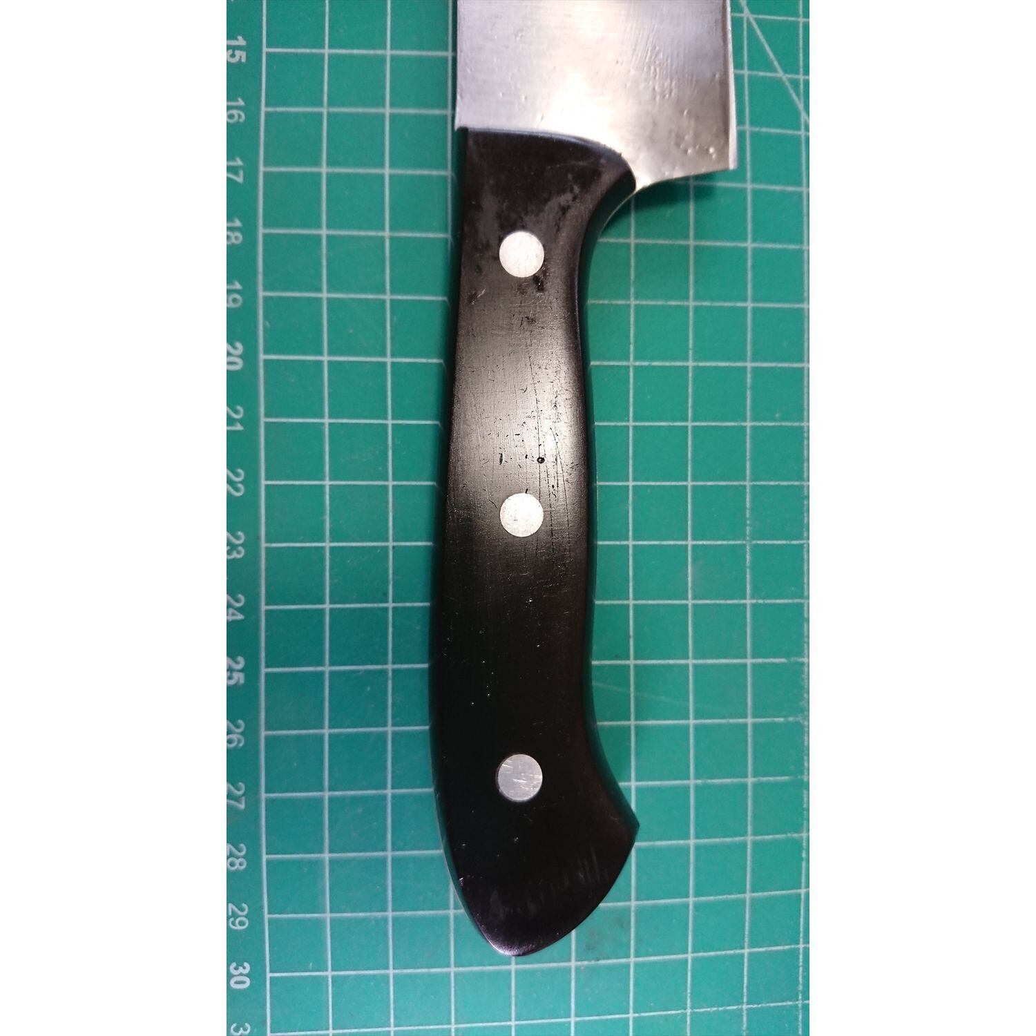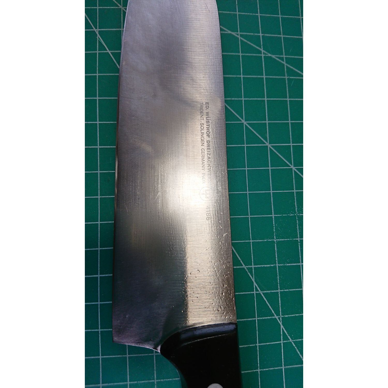 1. o2803/状態:中古/銘:WUSTHOF(ヴォストフ)/三徳包丁(両刃 左5:右5 右利き・左利き兼用)/刃長:170/峰厚 アゴ上:1.9/重量:154/作り:INOX(ステンレス系)/他:
