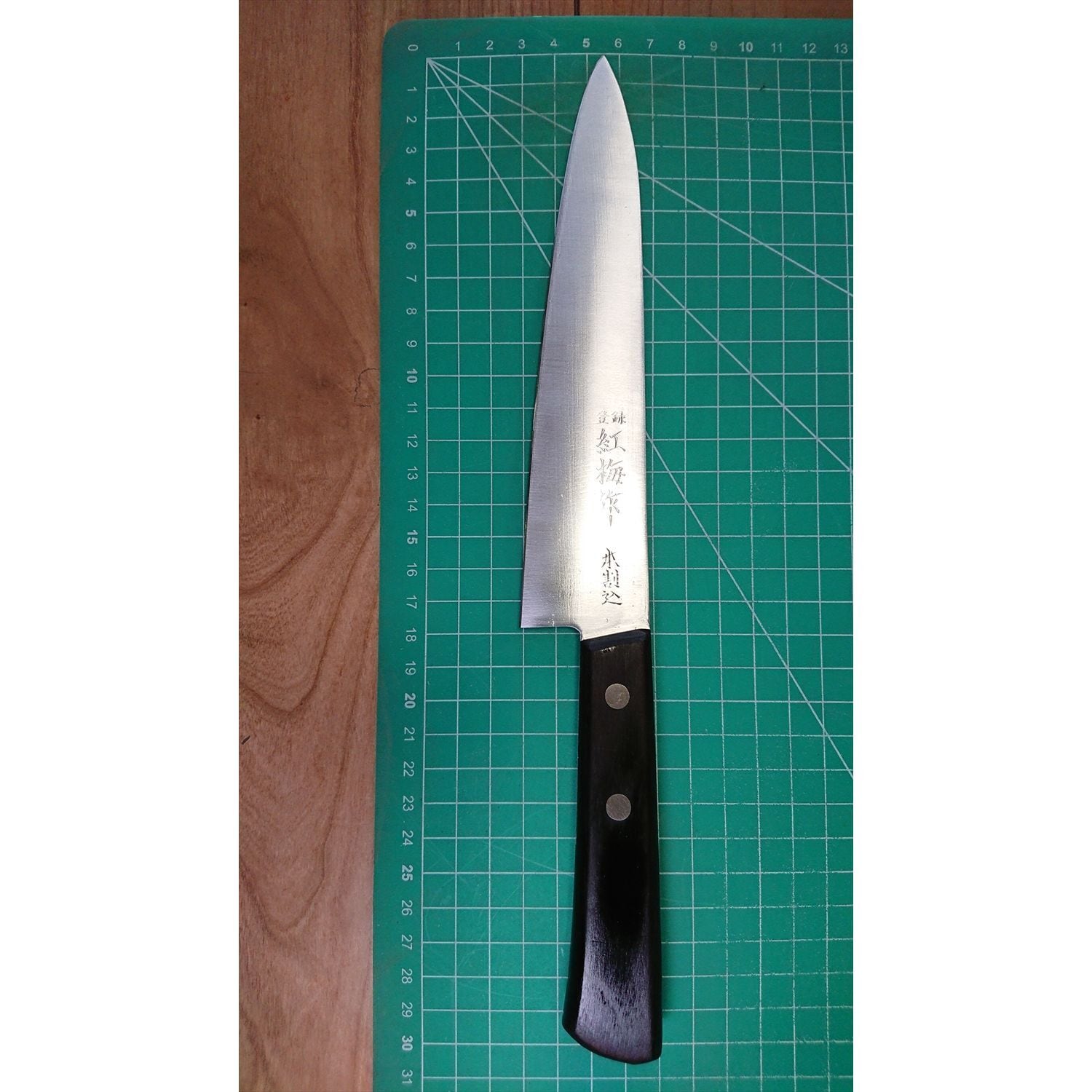 1. o2806/状態:中古/銘:紅梅作/牛刀(両刃 左5:右5 右利き・左利き兼用)/刃長:180/峰厚 アゴ上:1.7/重量:117/作り:本割込鋼(鋼をステンレスでサンド)/他: