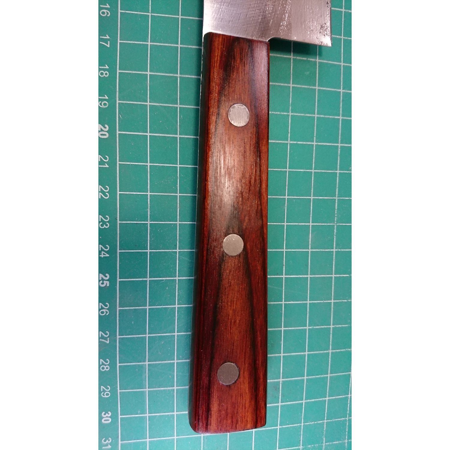 1. o2811/状態:中古/銘:吉祥/三徳包丁(両刃 左5:右5 右利き・左利き兼用)/刃長:165/峰厚 アゴ上:2/重量:160/作り:上作 本割込鋼(鋼をステンレスでサンド)/他:
