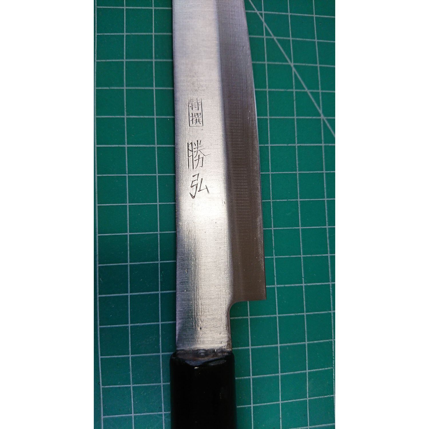 1. o2814/状態:中古/銘:勝弘/刺身包丁(両刃 左5:右5 右利き・左利き兼用)/刃長:205/峰厚 アゴ上:1.5/重量:66/作り:鋼/他: