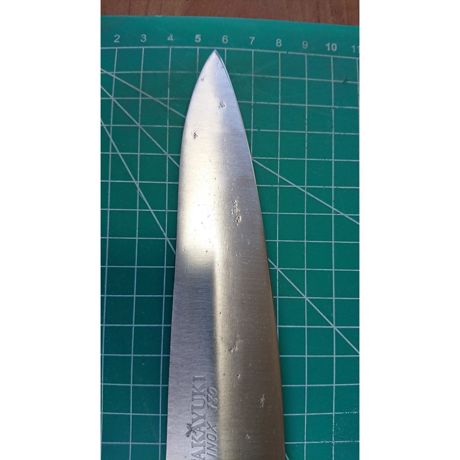 1. o2841/状態:中古/銘:TAKAYUKI(堺孝行)/牛刀(両刃 左5:右5 右利き・左利き兼用)/刃長:180/峰厚 アゴ上:1.6/重量:161/作り:INOX(ステンレス系)/他: