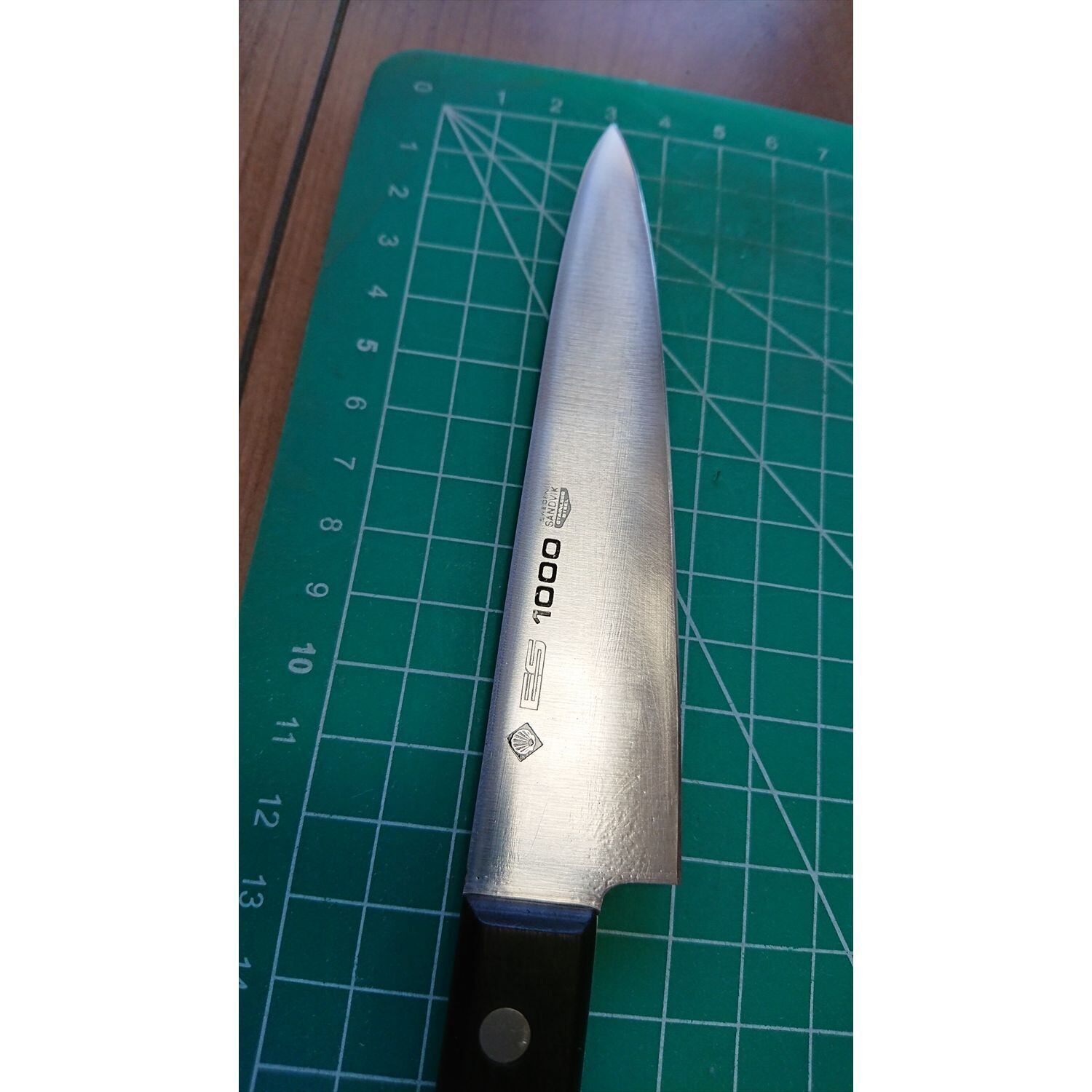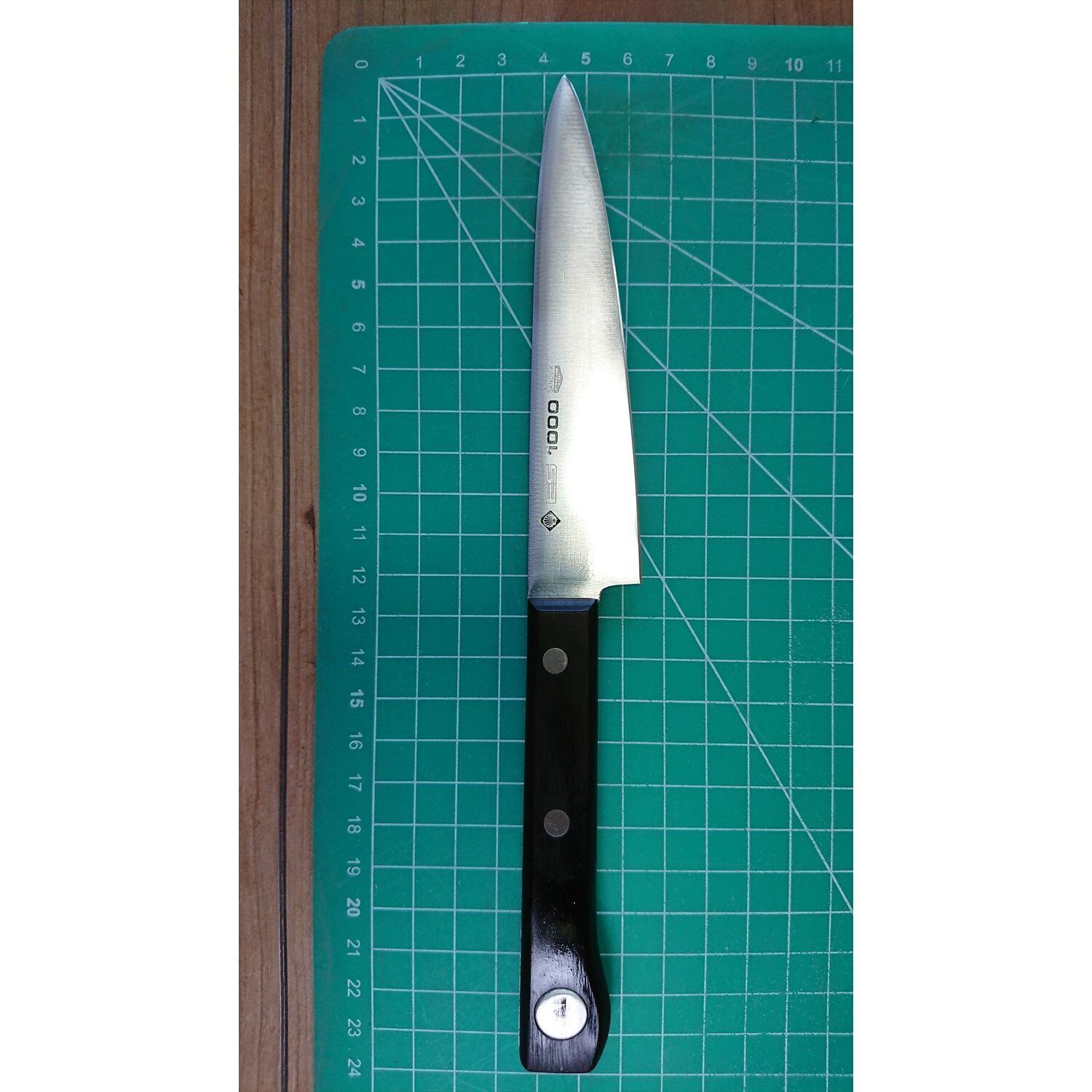 1. o2866/状態:中古/銘:KAI ES1000/ペティナイフ(両刃 左5:右5 右利き・左利き兼用)/刃長:120/峰厚 アゴ上:1/重量:56/作り:SWEDEN SANDVIK STAINLESS STEEL/他: