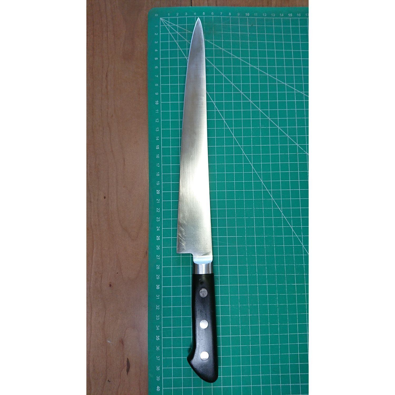 1. o2868/状態:中古/銘:TAKAYUKI(堺孝行)/筋引包丁(両刃 左5:右5 右利き・左利き兼用)/刃長:265/峰厚 アゴ上:2.4/重量:205/作り:INOX/他: