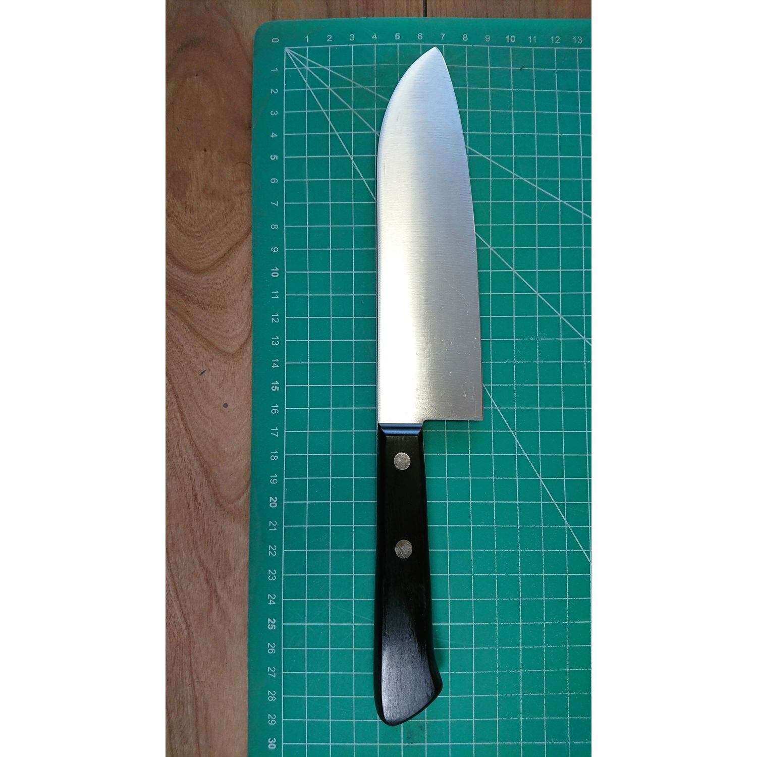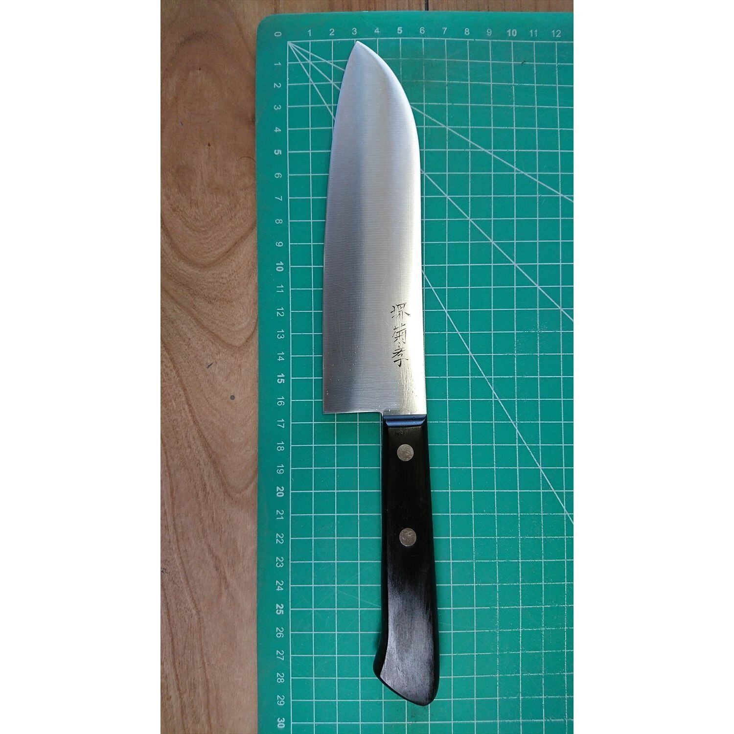 1. o2943/状態:中古/銘:堺菊孝/三徳包丁(両刃 左5:右5 右利き・左利き兼用)/刃長:165/峰厚 アゴ上:1.6/重量:105/作り:ステンレス/他: