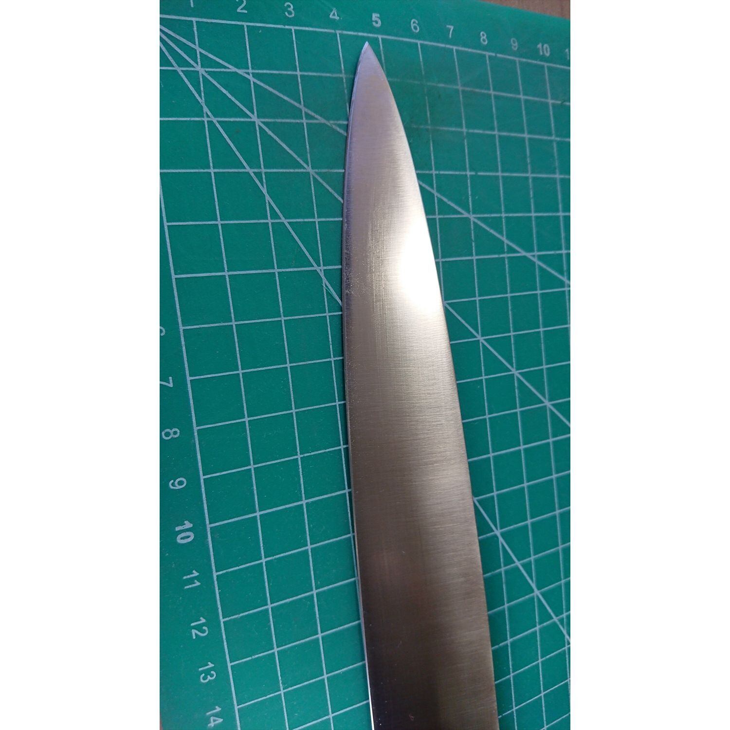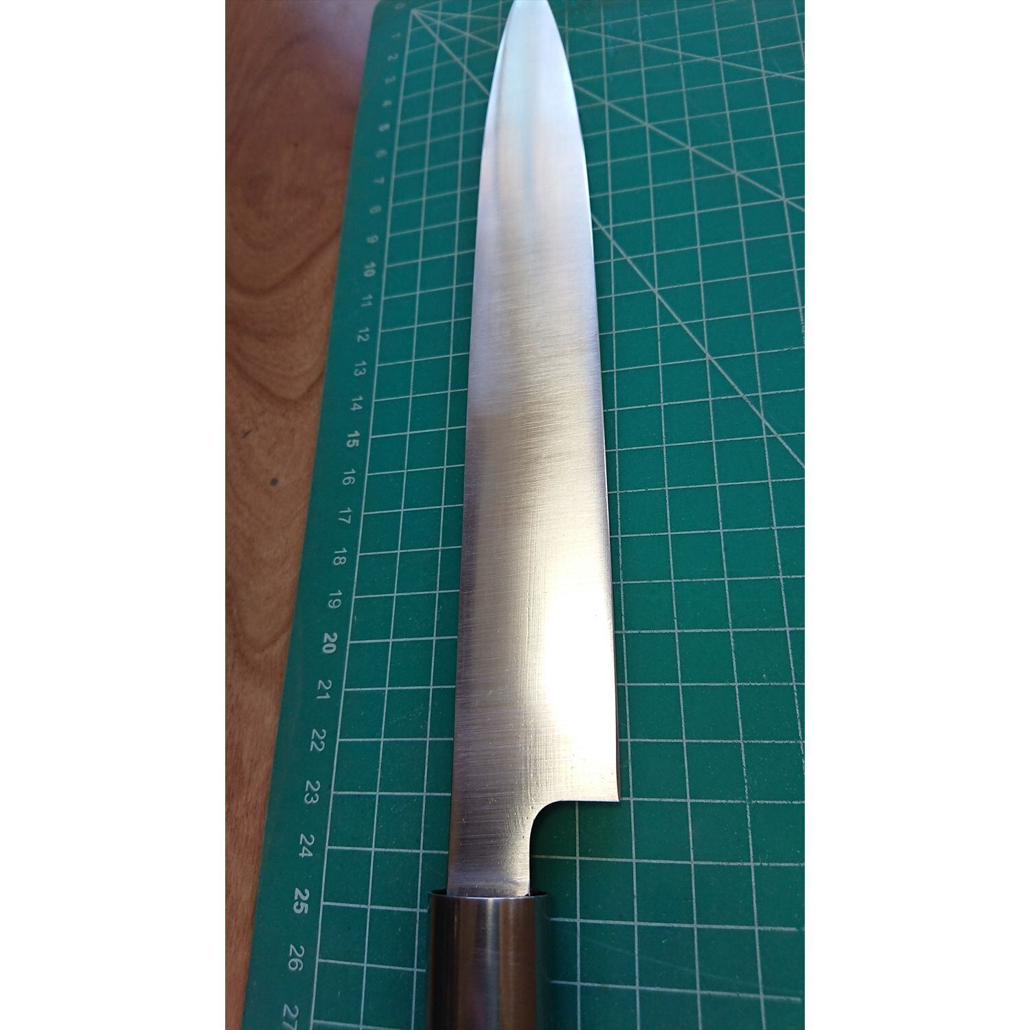 1. o2946/状態:中古/銘:銘?/筋引包丁(両刃 左5:右5 右利き・左利き兼用)/刃長:230/峰厚 アゴ上:1.6/重量:127/作り:ステンレス系/他: