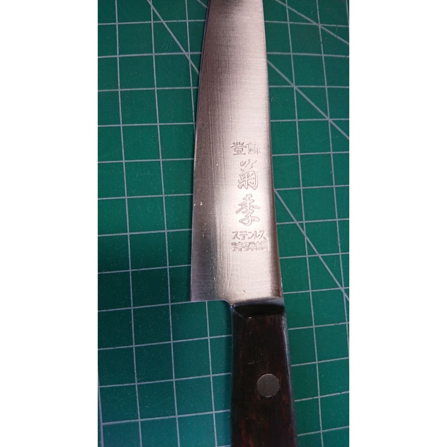 1. o2988/状態:中古/銘:菊季/ペティナイフ(両刃 左5:右5 右利き・左利き兼用)/刃長:120/峰厚 アゴ上:1.6/重量:54/作り:ステンレス特殊鋼/他: