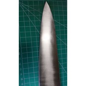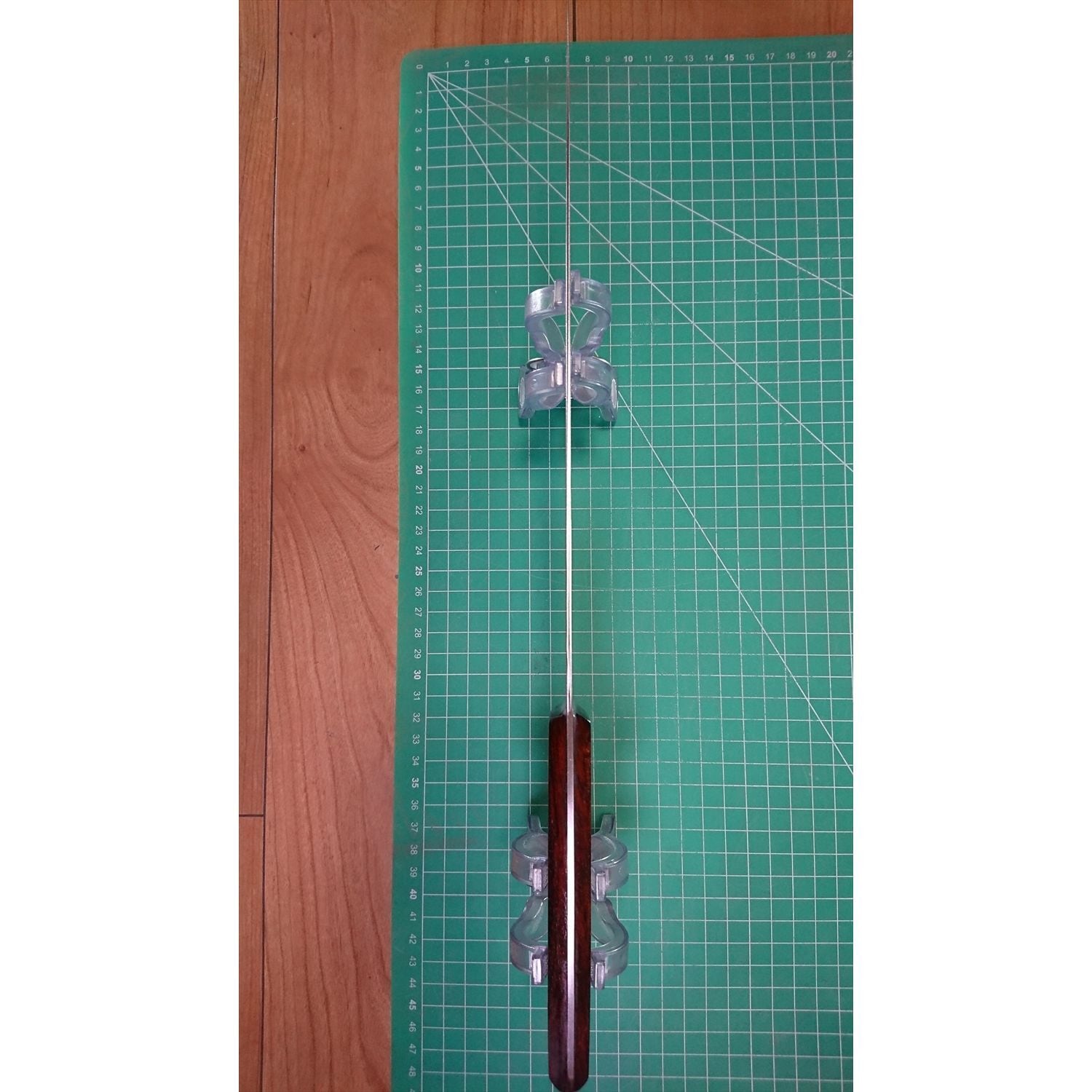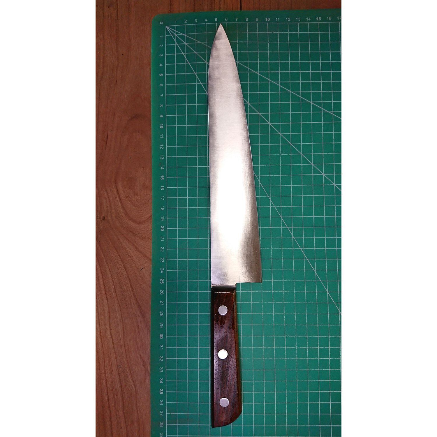 1. o3003/状態:中古/銘:長義/牛刀(両刃 左5:右5 右利き・左利き兼用)/刃長:250/峰厚 アゴ上:1.9/重量:144/作り:鋼/他:ツバの根元から柄全体にかけて樹脂コーティング済み(防サビの為)
