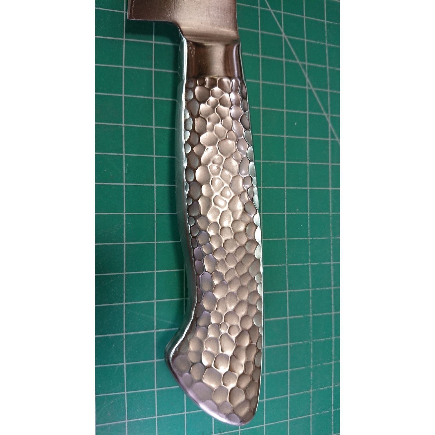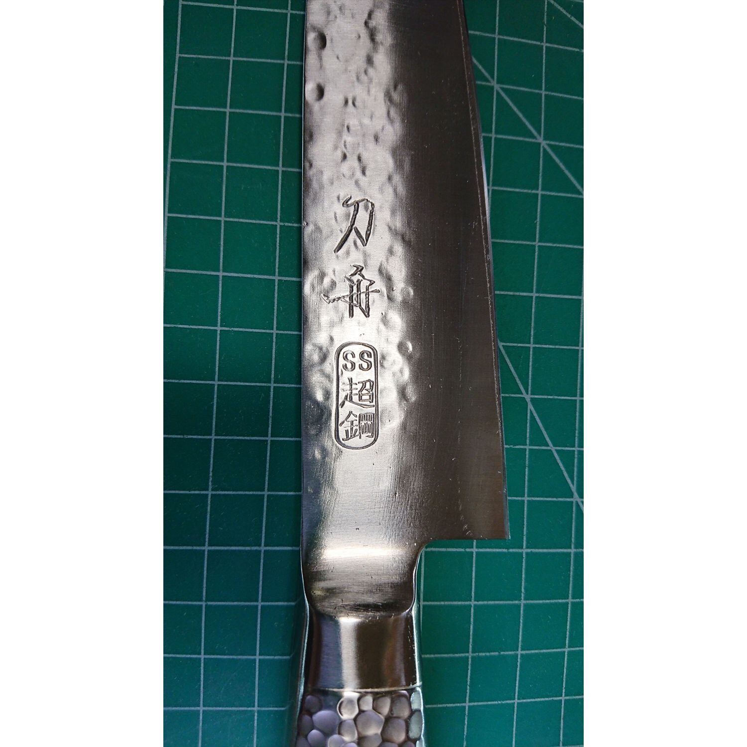 1. o3053/状態:中古/銘:刀舟 鎚目モナカ/三徳包丁(両刃 左5:右5 右利き・左利き兼用)/刃長:145/峰厚 アゴ上:1.8/重量:138/作り:SS超鋼(V金5号) 鎚目モナカ/他: