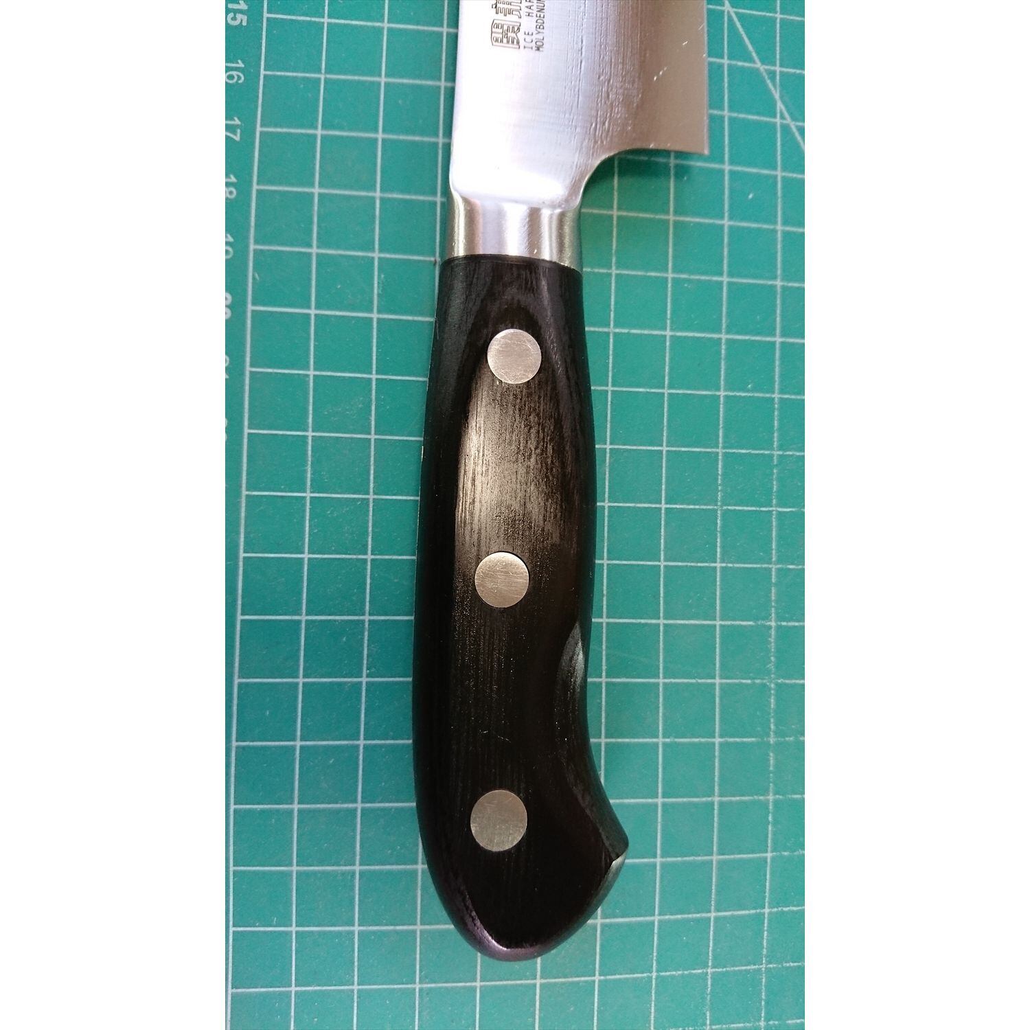 1. o2958/状態:中古/銘:関兼次 PRO・M/三徳包丁(両刃 左5:右5 右利き・左利き兼用)/刃長:170/峰厚 アゴ上:1.5/重量:148/作り:ICE HARDENED MOLYBDENUM STEEL/他:
