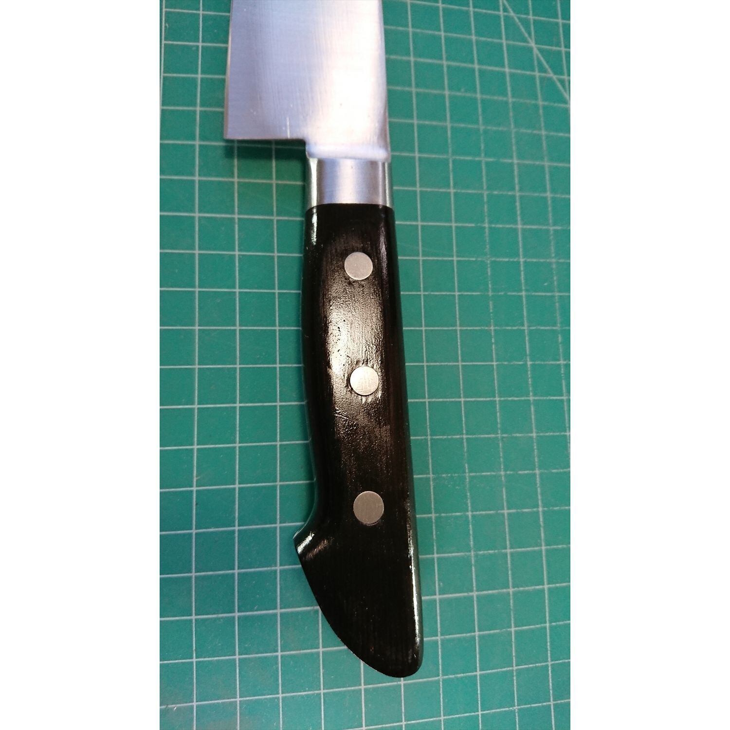 1. o3046/状態:中古/銘:源實光/牛刀(両刃 左5:右5 右利き・左利き兼用)/刃長:235/峰厚 アゴ上:2.2/重量:201/作り:日本鋼/他:ツバの根元から柄全体にかけて樹脂コーティング済み(防サビの為)