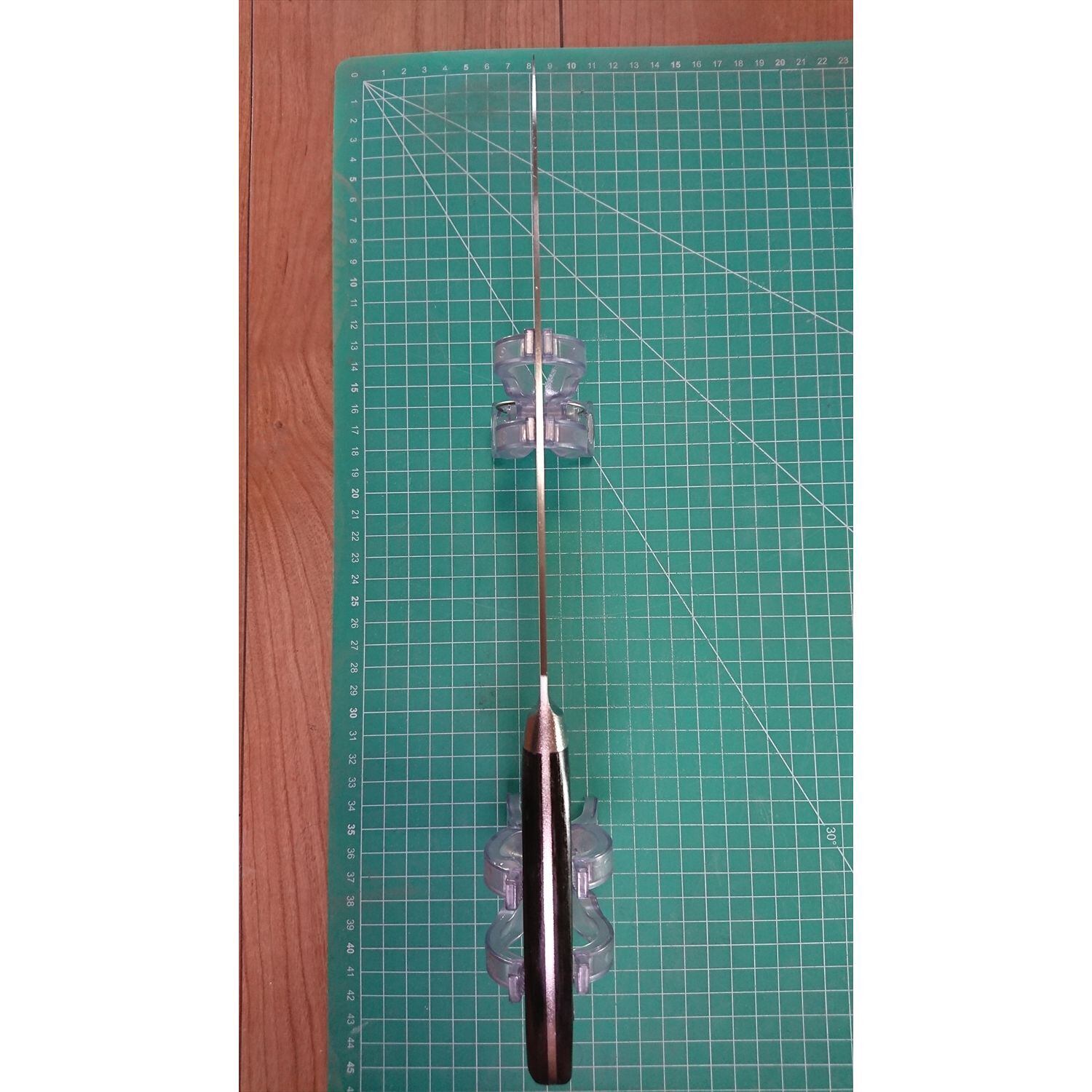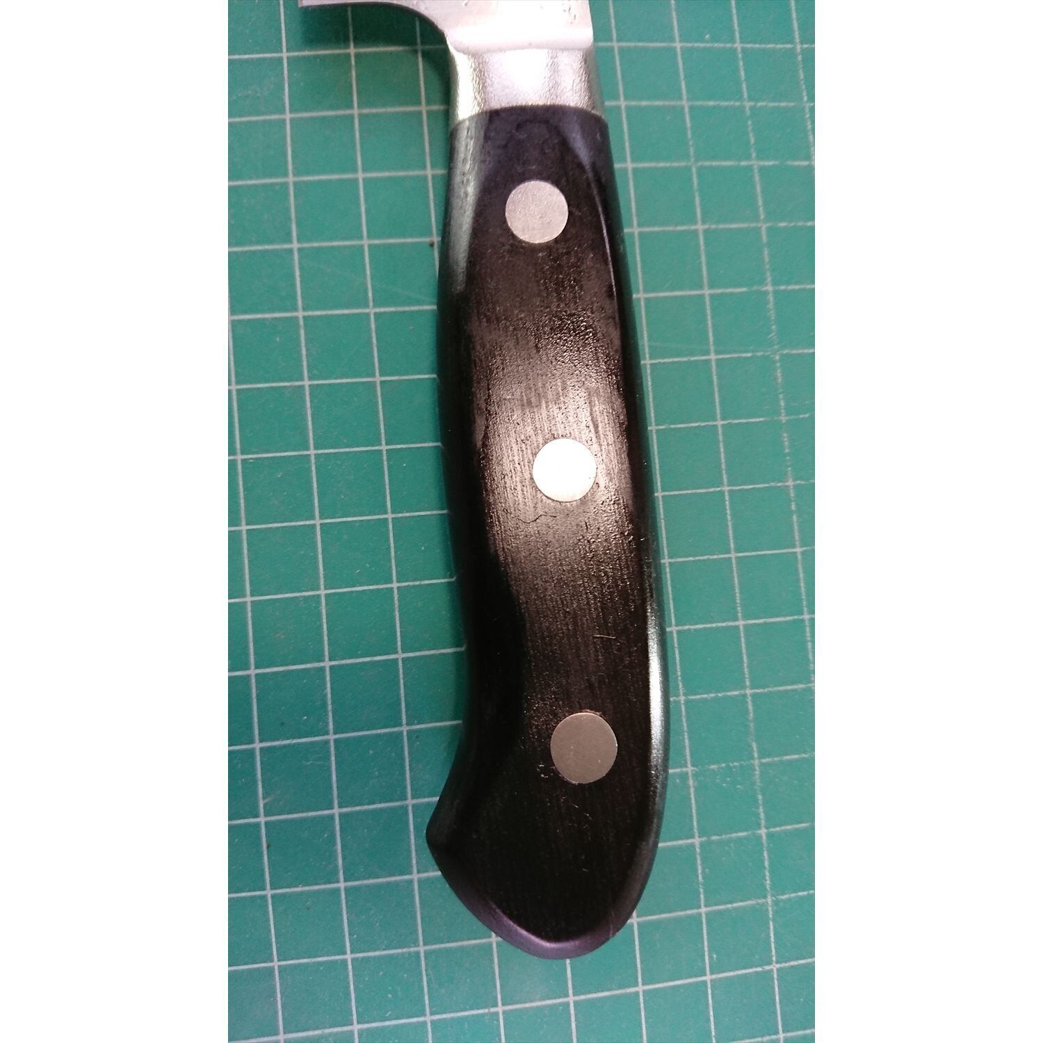 1. o2970/状態:中古/銘:銘?/筋引包丁(両刃 左5:右5 右利き・左利き兼用)/刃長:205/峰厚 アゴ上:2.2/重量:160/作り:ステンレス系/他:柄に一部ヒビがあった為補修済