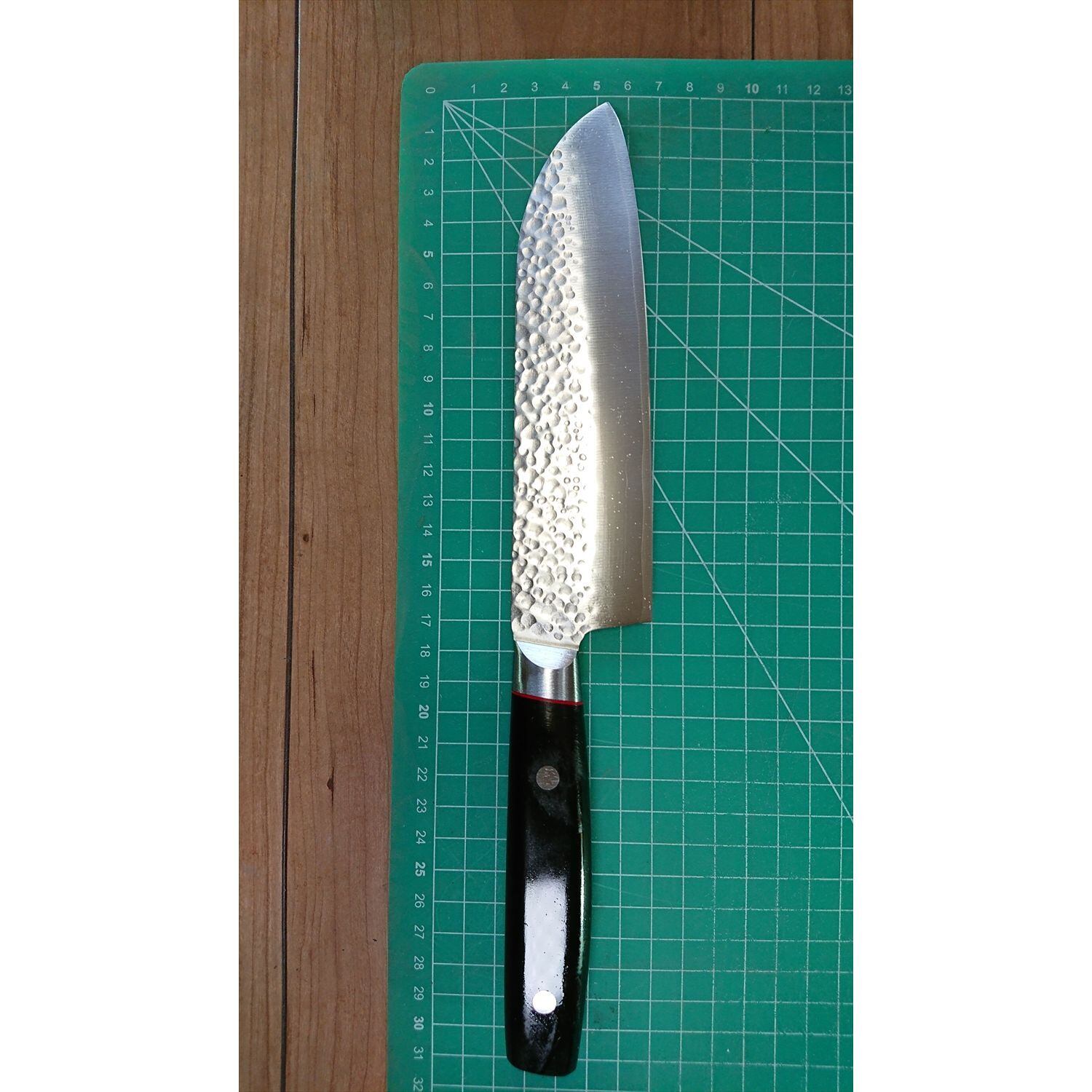 1. o2904/状態:中古/銘:銘?/三徳包丁(両刃 左5:右5 右利き・左利き兼用)/刃長:170/峰厚 アゴ上:2/重量:206/作り:鎚目鍛造 ステンレス系/他: