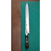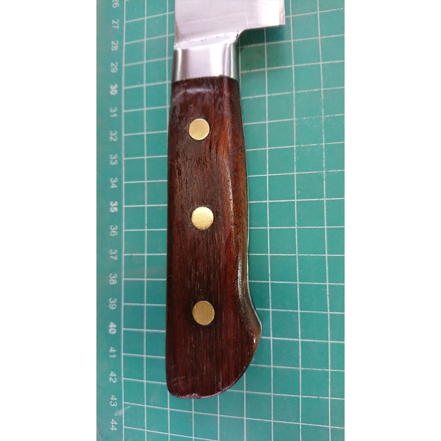 1. o2842/状態:中古/銘:助麿/牛刀(両刃 左5:右5 右利き・左利き兼用)/刃長:285/峰厚 アゴ上:1.5/重量:227/作り:安来鋼/他:ツバの根元から柄全体にかけて樹脂コーティング済み(防サビの為)
