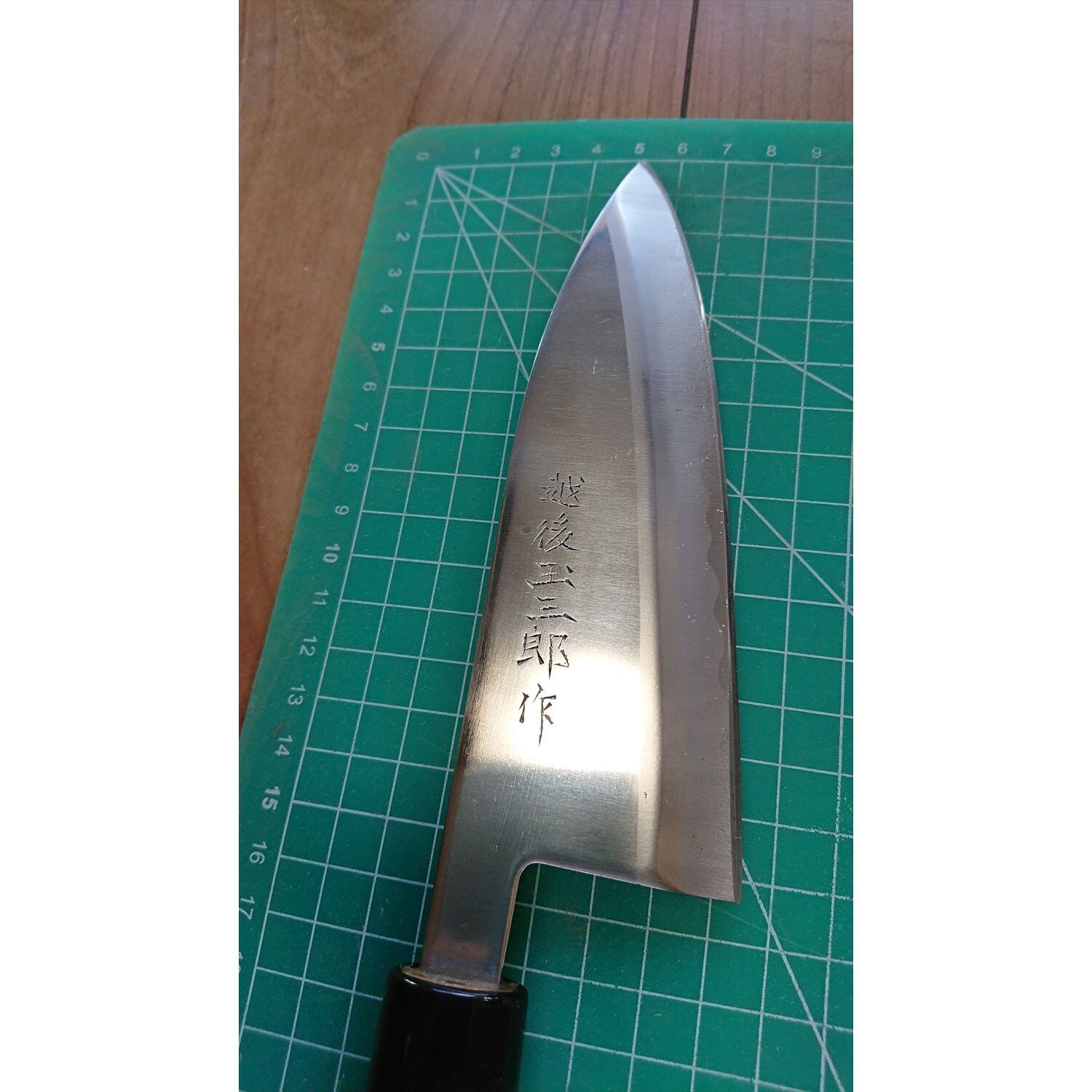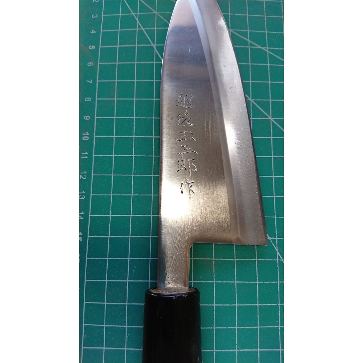 1. o3044/状態:中古/銘:越後玉三郎/相出刃包丁(片刃 右利き用)/刃長:155/峰厚 アゴ上:3.1/重量:150/作り:ステンレス鋼/他: