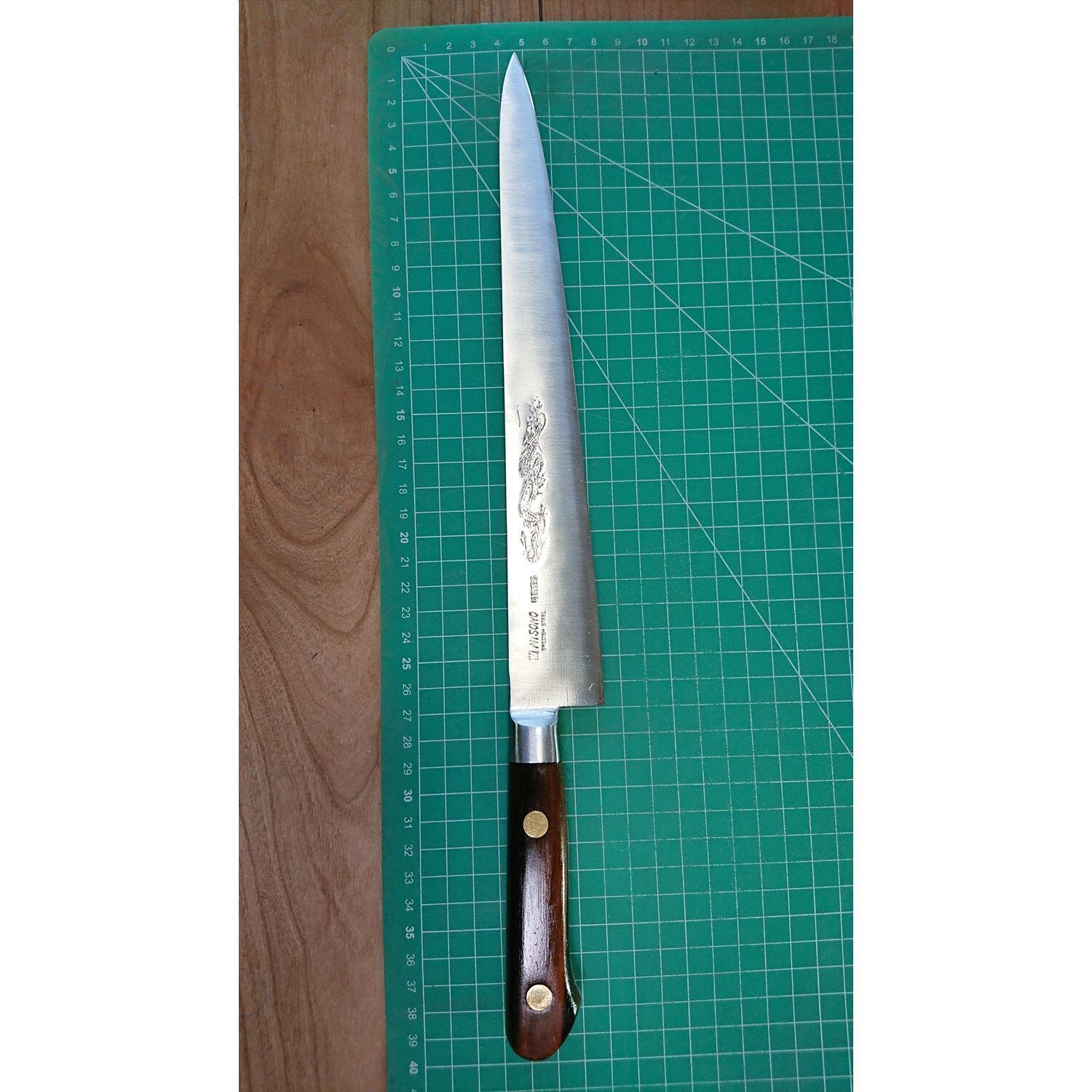 1. o3057/状態:中古/銘:MISONO(ミソノ) 特製鍛造/筋引包丁(両刃 約 左1:右9 右利き用)/刃長:270/峰厚 アゴ上:2.3/重量:179/作り:SWEDISH STEEL 龍の彫刻入り/他:ツバの根元から柄全体にかけて樹脂コーティング済み(防サビの為)