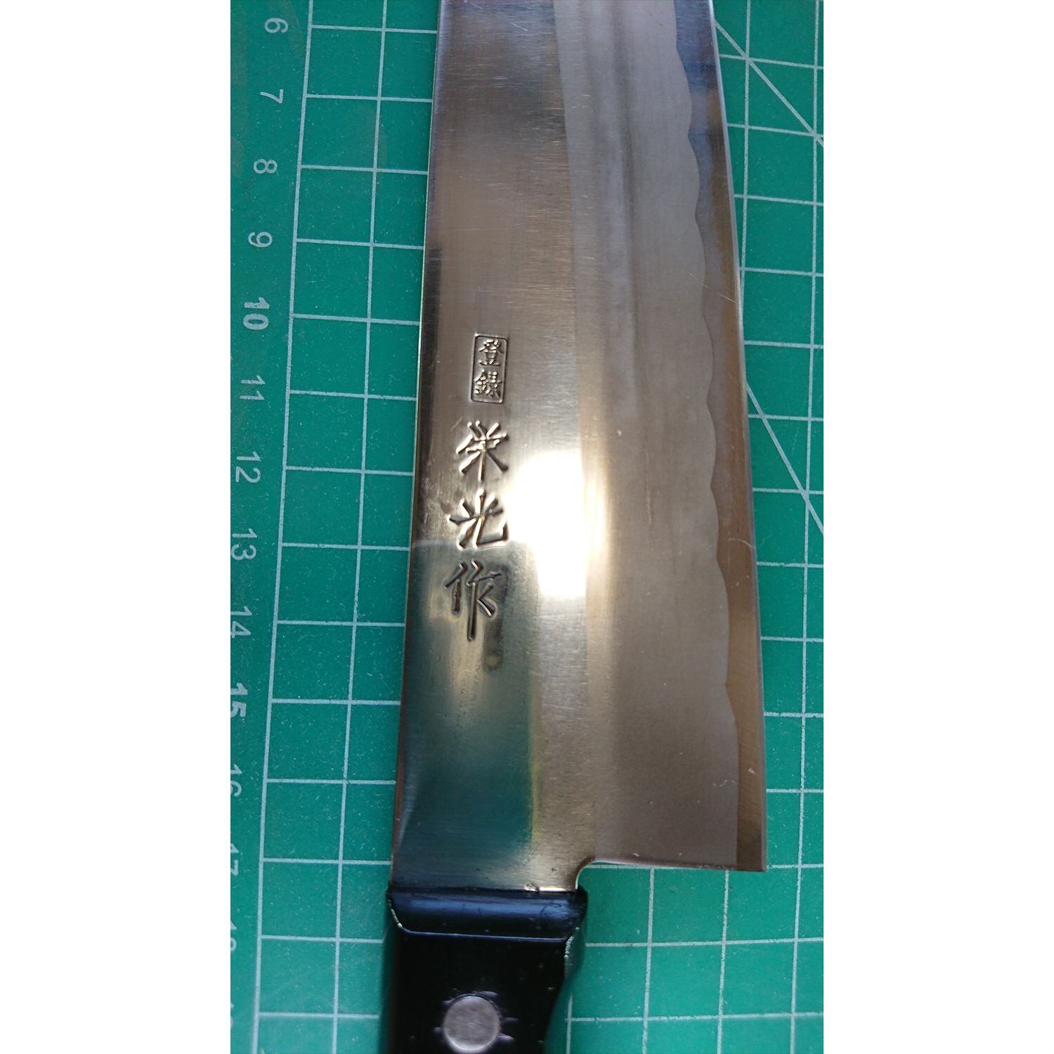 1. o3031/状態:中古/銘:栄光/三徳包丁(両刃 左5:右5 右利き・左利き兼用)/刃長:165/峰厚 アゴ上:1.4/重量:104/作り:ステンレス/他: