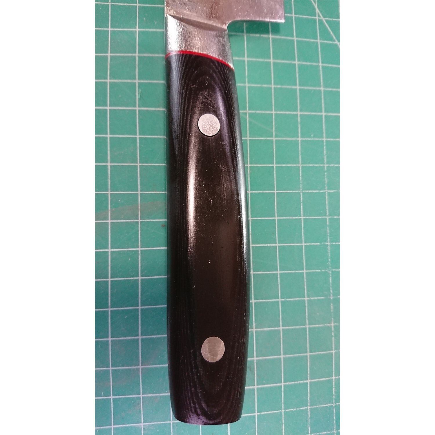 1. o2896/状態:中古/銘:銘?/三徳包丁(両刃 左5:右5 右利き・左利き兼用)/刃長:170/峰厚 アゴ上:2.2/重量:225/作り:霞流し ステンレス系 ハンドル素材 マイカルタ/他: