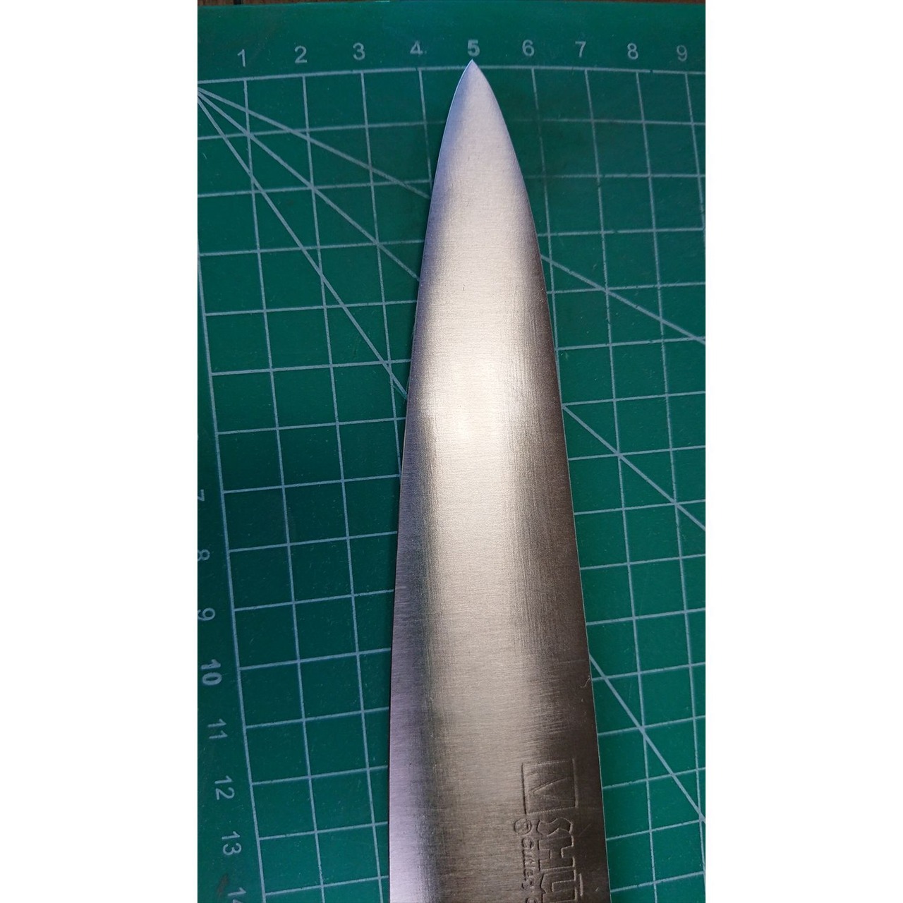 1. o2848/状態:中古/銘:シュウコウ/牛刀(両刃 約 左1:右9 右利き用)/刃長:195/峰厚 アゴ上:2.1/重量:152/作り:ステンレス系/他: